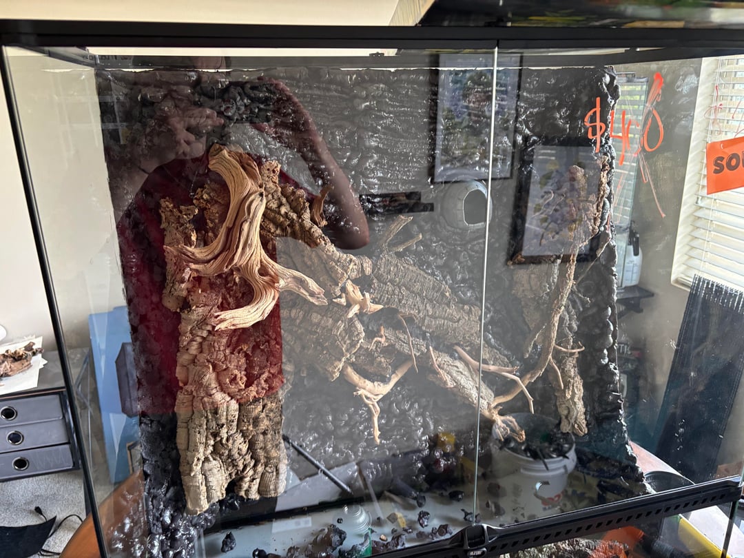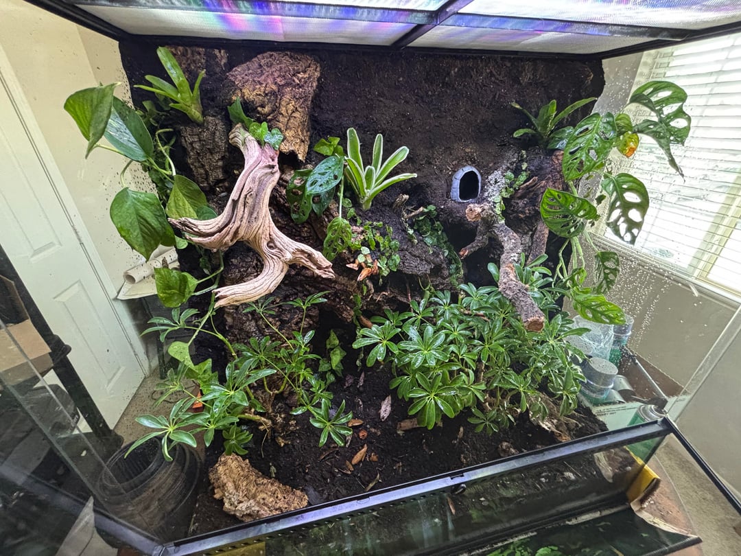 It twas a long and expensive process but it was definitely worth the effort. I’m pretty proud of it, so I just thought I’d share. It is a 36x18x36 exo terra vivarium built with silicone, expanding foam, cork bark, and reptisoil. I made the little cave with polymer clay. It has schefflera, monstera, pothos, creeping fig, Ivy, and bromeliads planted inside. The cuc is diary cow and powder blue isopods. A adult chahoua gecko will live in it soon once it grows in. I may get him a girlfriend if he takes to it well.
