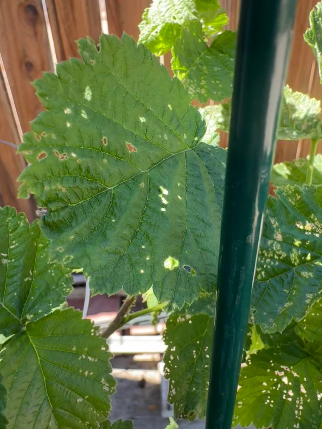 What’s making these holes in the leaves? I live in the Mojave Desert area of Southern California, so it gets hot here, but the plant has been healthy-looking all year, and suddenly these holes developed. They’re only in the top leaves of the plant. The lower leaves still look healthy. The third picture is the healthy leaves for reference.