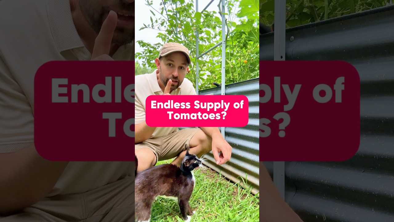 Here’s one way to get an endless supply of tomatoes. So, this is the first year that I’ve tried this and it actually worked. I sort of can’t believe it, but these right here are little plants that I grew from the mother plant. So, what you do is you take your snips and you grab what’s called a sucker. And suckers come out of the angles of the tomato. So, this is the main trunk. This is a branch. And this coming out at a 45°ree angle is the sucker. So, we’re going to cut that back right here. Now that I got my sucker, you can actually root this just by sticking it in the ground. All you need to do is strip the bottom branches off of it, dig a small hole, really about the same diameter as the branch itself, and you’re going to stick it down in there. And in no time, this is going to root into a new plant. And just to prove that it worked, I’m actually going to dig this one out because I am so curious what the roots look like on this. And check that out. This little cutting put out all these roots.