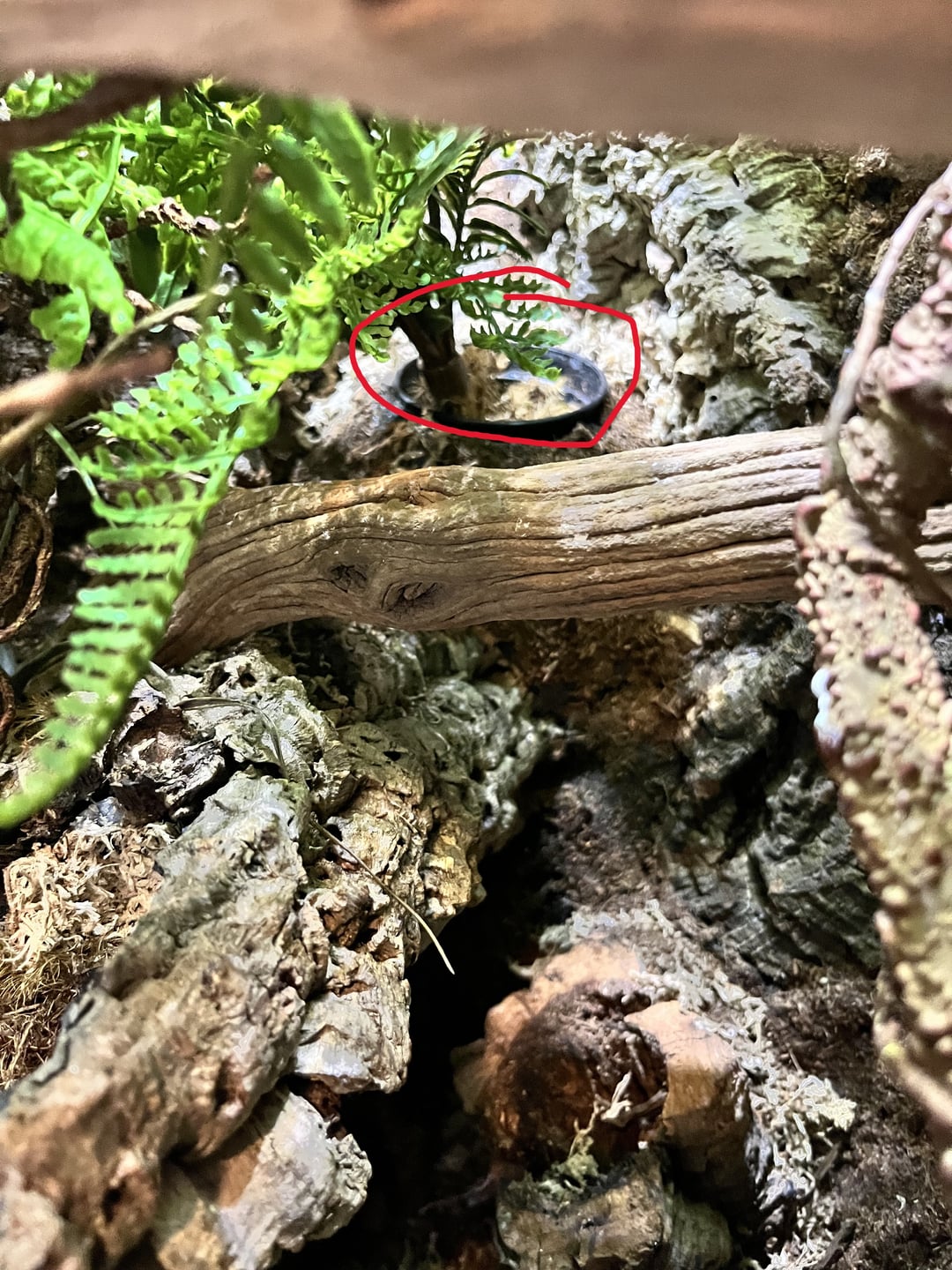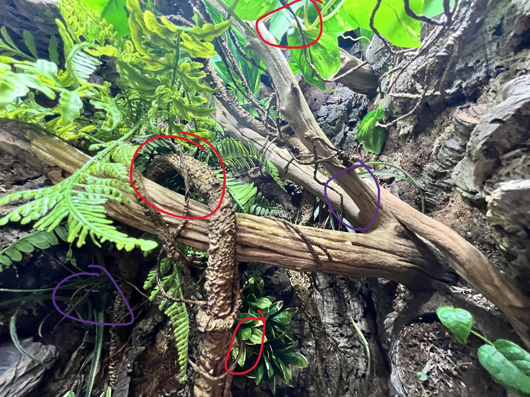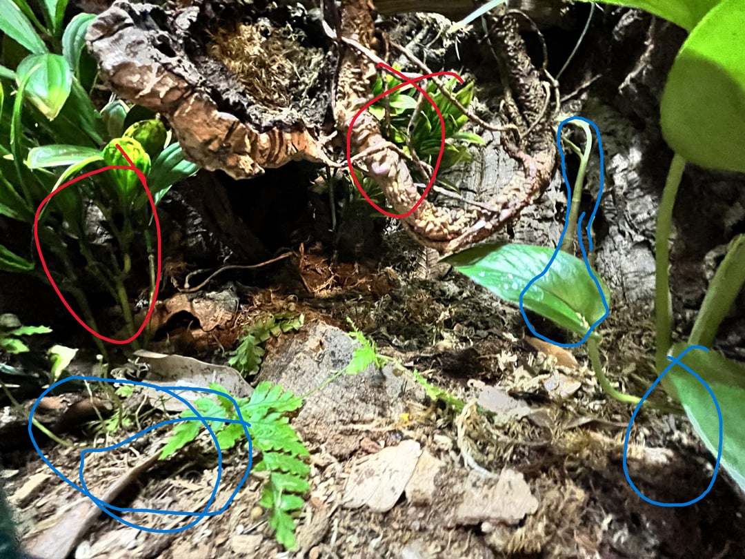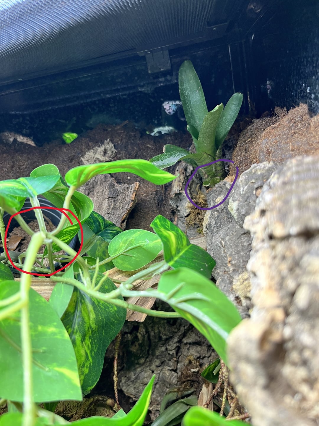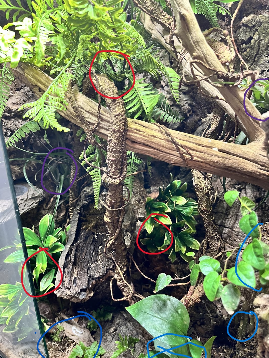 So here is my crested geckos bioactive enclosure i built, hes been in it for a couple months with some live plants and CUC, the live plants werent doing good so i replaced some of them with fake plants recently. When i built the cage i forgot to make places for planter pots and stuff but i was able to make small places for only 3 inch pots. In the first photo, the plants circled in bue are the live plants, the purple are tillandsia and a bromeliad, the red are fake plants. The only live plant that looks okay is the pothos down in the bottom right corner. The live plant behind it was a Dieffenbachia Compacta which has lost all of its leaves and is needed to be replaced. The live plant in the bottom left is an Autumn Fern, its surviving but its not provinding any coverage and it doesnt look good. The plant on the right wall is a Creeping Fig, its been alive the longest but it hasnt spread like vines are supposed to, it just doesnt add to the enclosure. The purples are tillandsia which were doing good but now have gone limp and kind of fell in health, and the bromeliad isnt rooting and it keeps falling over and doesnt feel right to touch. I had live plants in the top 2 fake plant spots and they did not do well, i had a golden pothos in the top and a Schefflera Arboricola in the left one. The 2 top fake plants and the creeping fig are the only places for the plant pots but theyre only 3 inch pots, i cant fit bigger ones in. I spray the cage heavily at night up to like 80-90 humidity. I also water the plants every couple of days if needed. I need some advice on what to do/add to make this enclosure more enjoyful and lively. I would like to add/replace all the plants in it if i could get some suggestions as to what would be great.