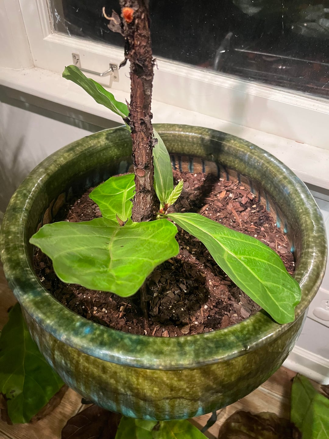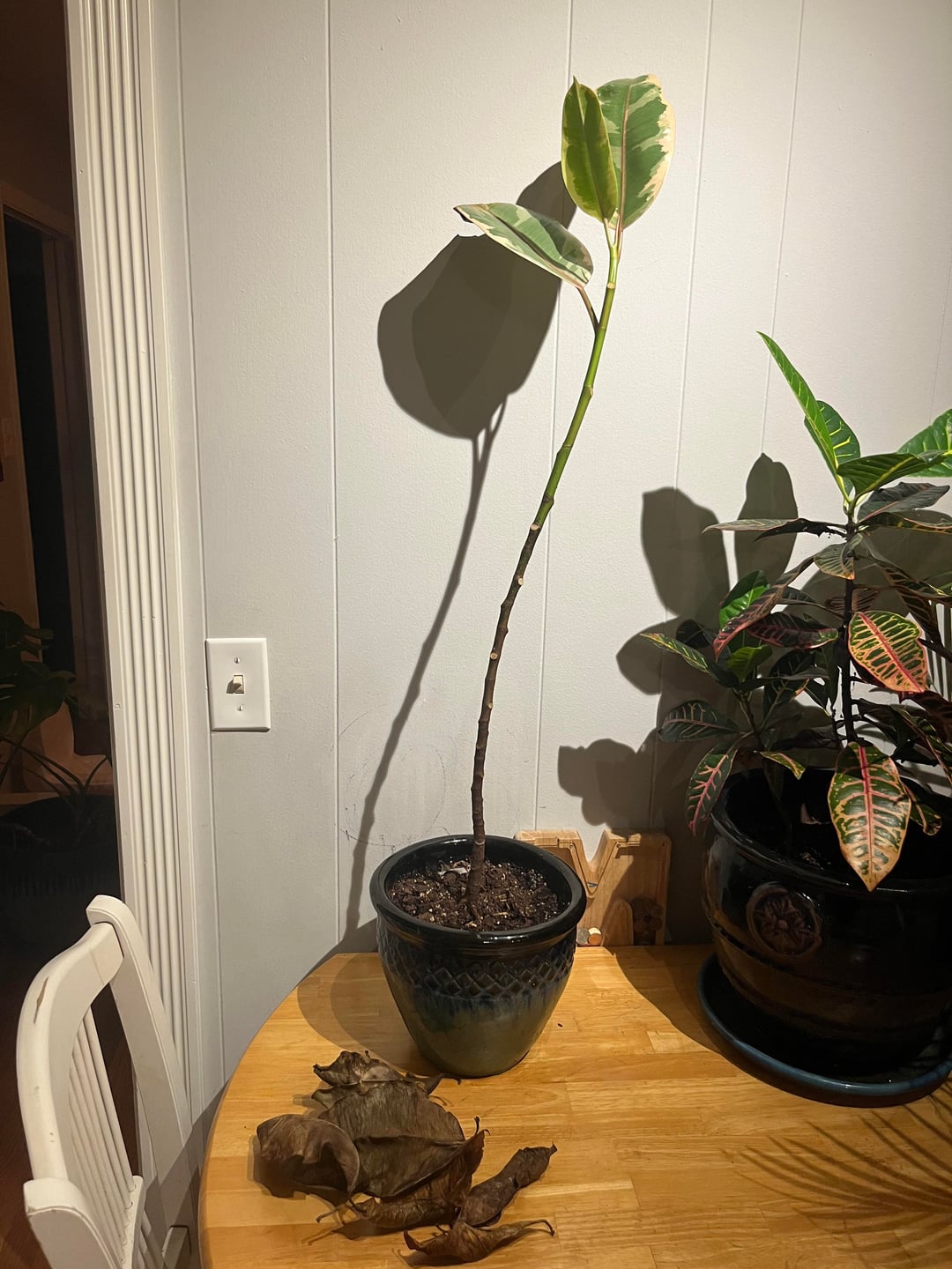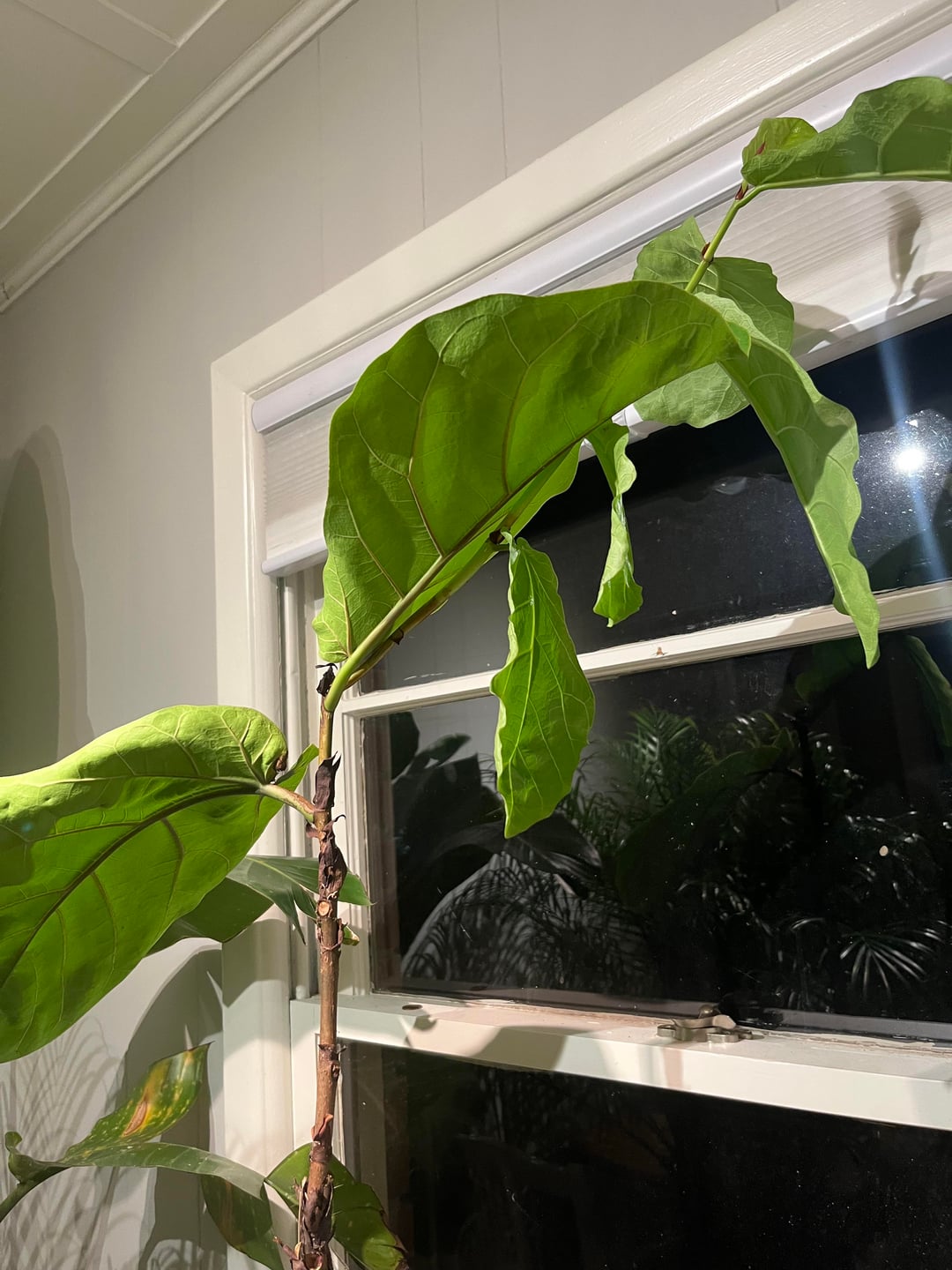 The fiddle was damaged during a storm recently with a large branch breaking the top 3 leaves. It already needed to be repotted, so after the storm I did that and moved it to a new spot in the house. I expected to lose a few leaves from all the stress, but this is crazy. Have never had a plant do this.