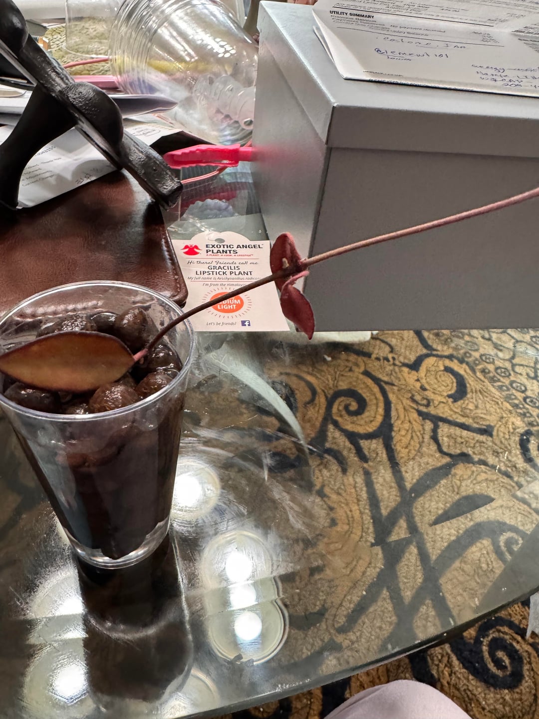 I was at a large local farm store near me and saw a Hoya I had not seen before. I picked it up to look at it and a long vine broke. Someone had set a very heavy plant on top of the runner. I went to the woman running this area showed her what happened and asked if I could have the broken piece? I had 2 other plants in my cart plus soil, perlite, leca, and my dog. She smiled and said, “of course it would have just died there alone and thirsty. Happy rehab”. Then she took me to another table and said these were basically all going into the discount table so have my pick.