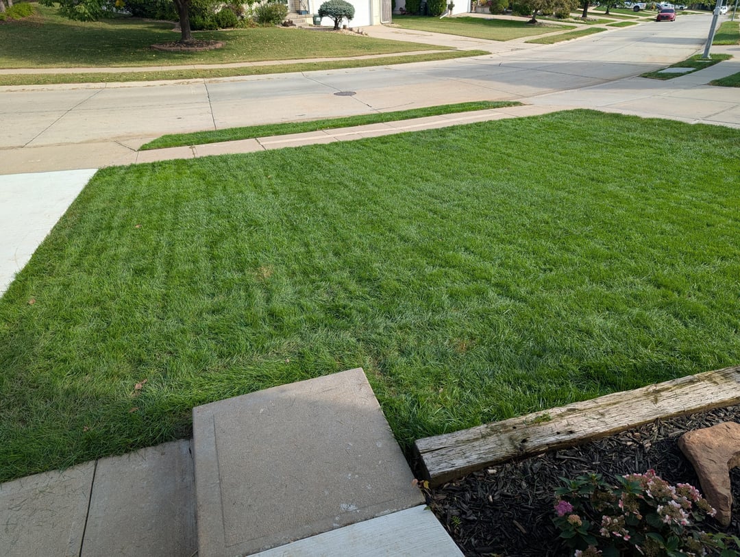 I overseeded on Sept 6 after aerating and dethatching twice due to excessive thatch in the area of my backyard with dense KBG. Yesterday I purchased a Fiskars StaySharp Max reel mower because the TTTF was getting long but I am worried about any ungerminated KBG being sucked up by my rotary mower. I only had a chance to mow the front lawn with it so far and I think it's looking fantastic, but even the unmowed backyard looks great. I absolutely love the color.