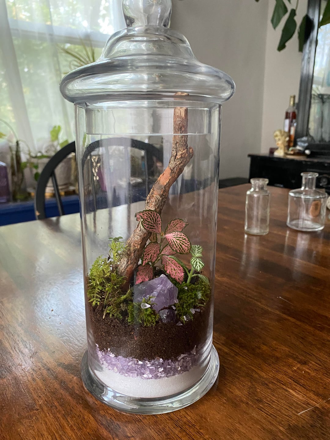 Anyway, going to see how these 2 do and if the amethyst one is alive and doing well by December I’m hoping to gift it to my sister. So here’s hoping that “this terrarium can thrive.” 💚✨