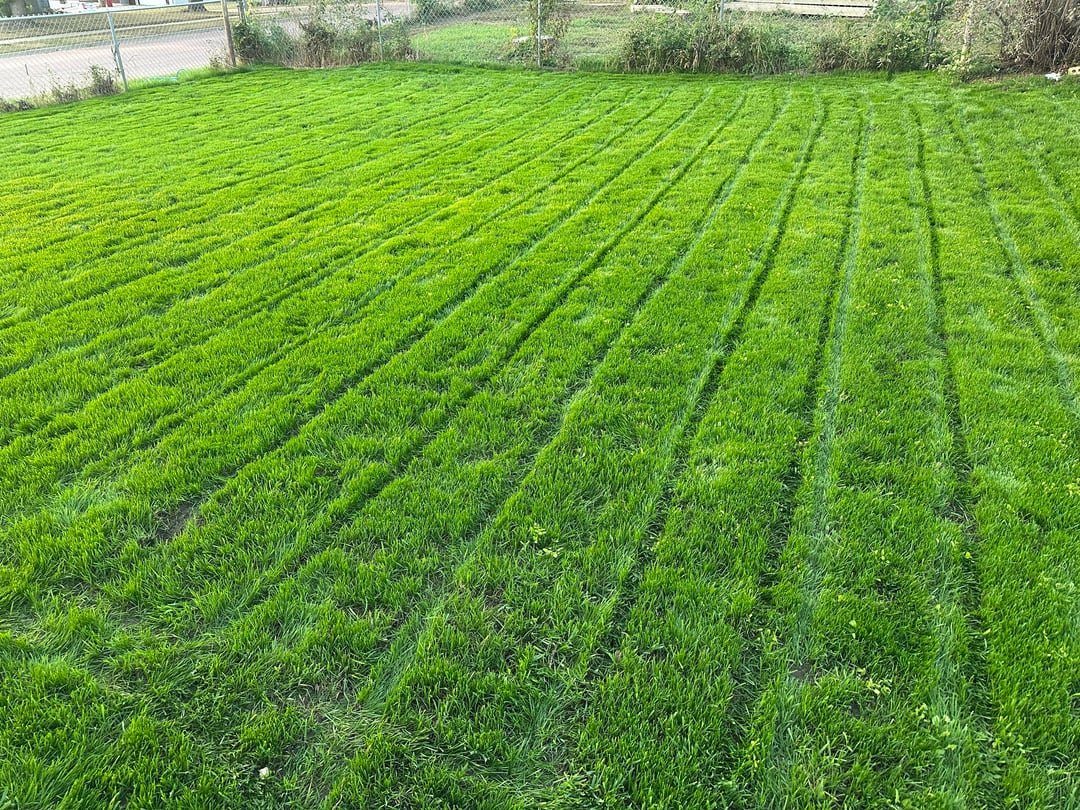 Complete reseed. Killed and tilled lawn. I’ve mowed three times now at about 2.5 inches. And just switched from watering 4 times per day to 2. It’s starting to fill in more and kbg is starting to actually come up at this point to begin filling in bare spots.