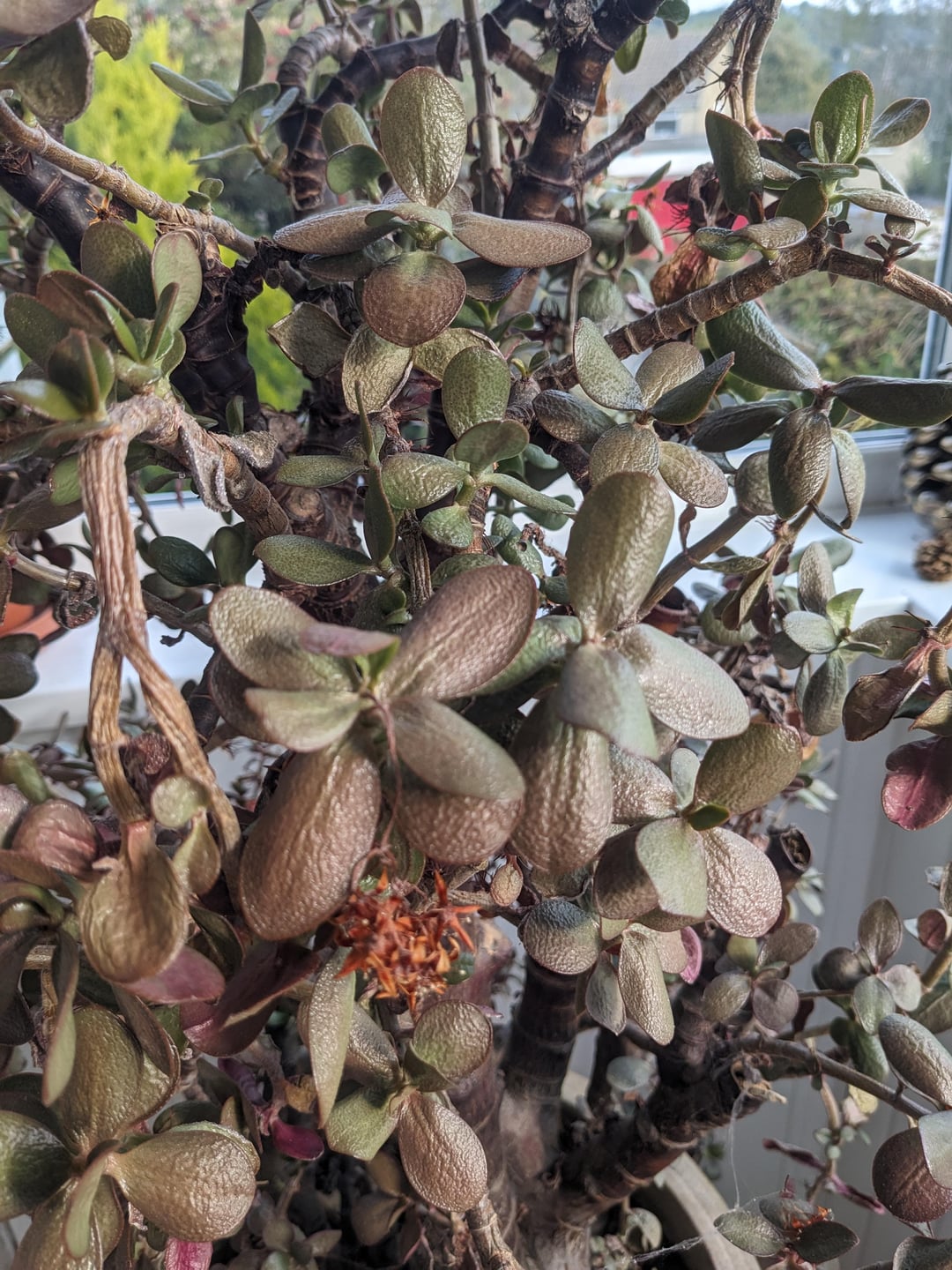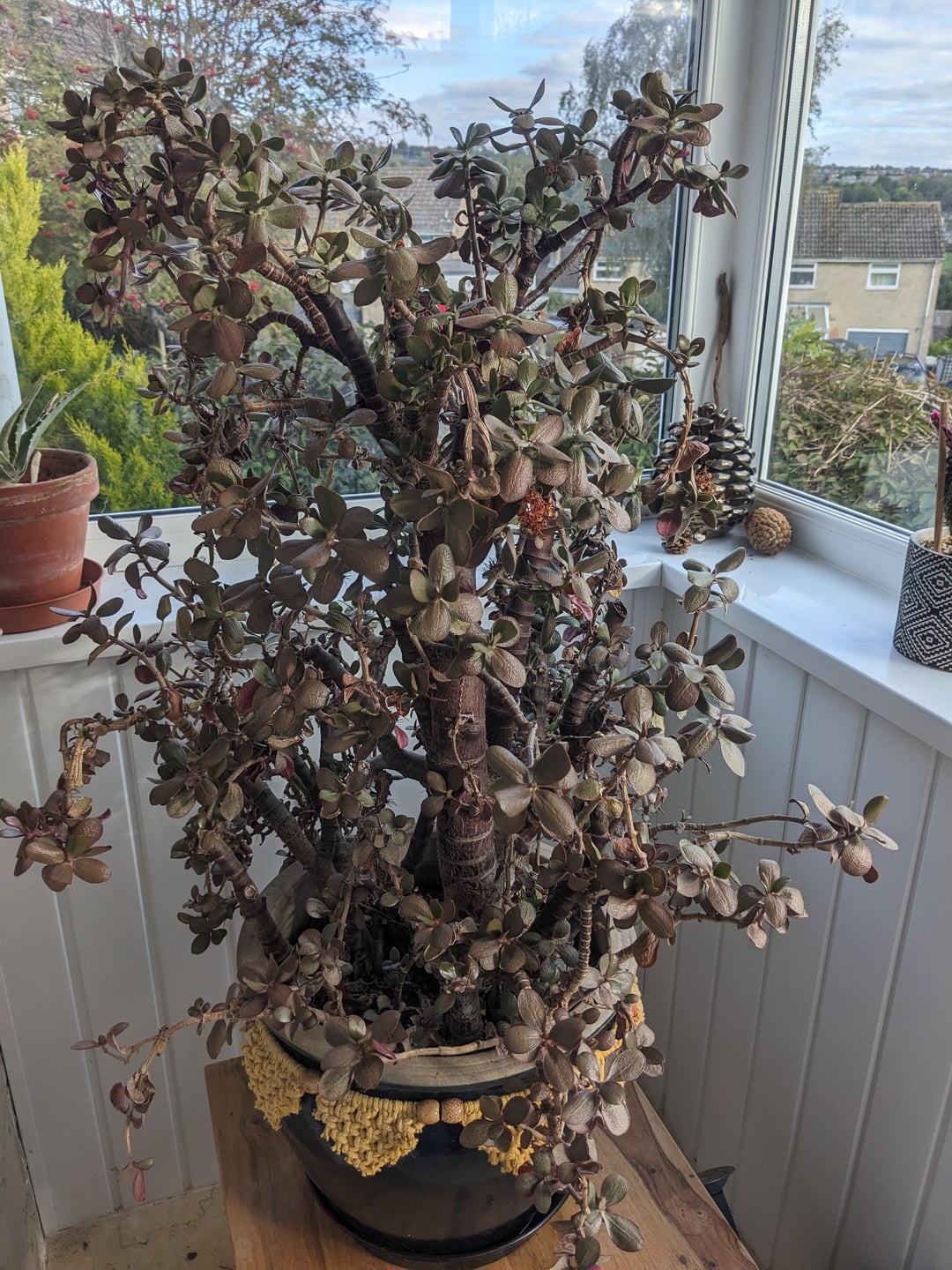 Please help! I was very kindly donated this beauty about 10 years ago but this year she's struggling. She flowered, and now looks like this. I've never repotted her and the top of the soil has alot of dead fallen bits in it. She sits in a south facing glass porch so has good heat over the summer and in the sun. Yesterday I watered her with succulent fertilizer.