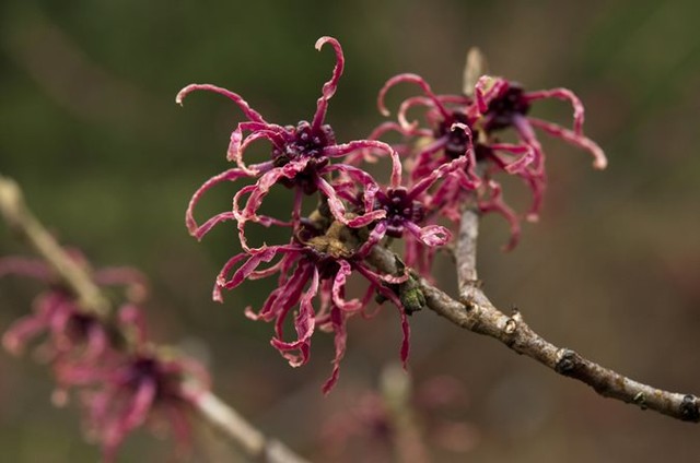 Dark red flowers are smaller than those of other witch hazel varieties and emit a mild fragrance. Photo by Wiert Nieuman / Shutterstock.