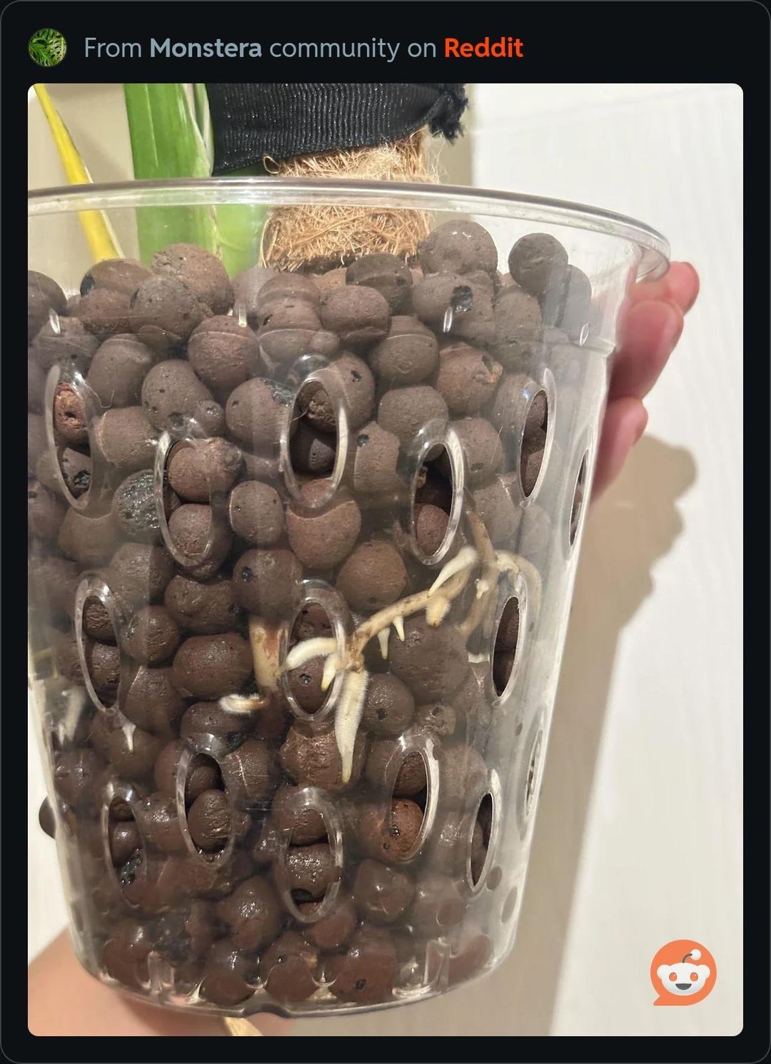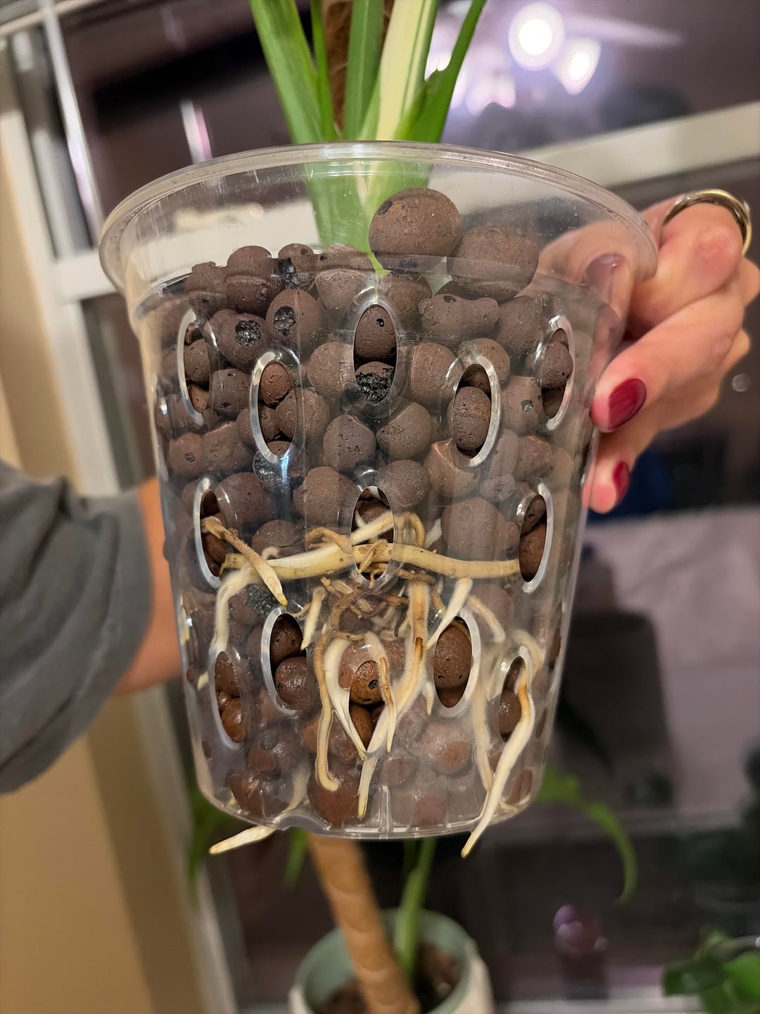 Just wanted to share a 1 month update of my Thai con that I transitioned into leca! She’s thriving and she has two aerial roots growing out of one aerial root, she’s happy happy!