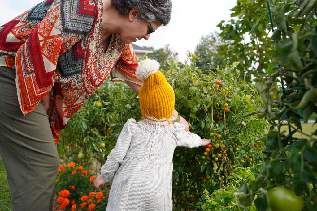 Rev. Mechille Boldt helps the reporter’s toddler daughter, Flannery McAllister, pick cherry tomatoes at Oasis Garden on Sept. 10. The garden’s bountiful produce is available for free to all in need. PHOTO BY RUBY F. MCALLISTER