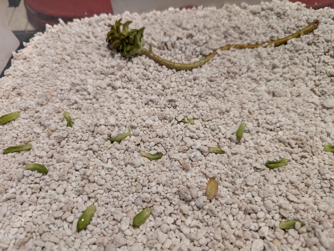 shebringsdathings 2 weeks ago Alocasia scalprum first pic, in a very tentative state, fresh outta the corm. i would get it in leca quickly. The others look like some sort of sedum, and they may prop like this. rooting hormone might help