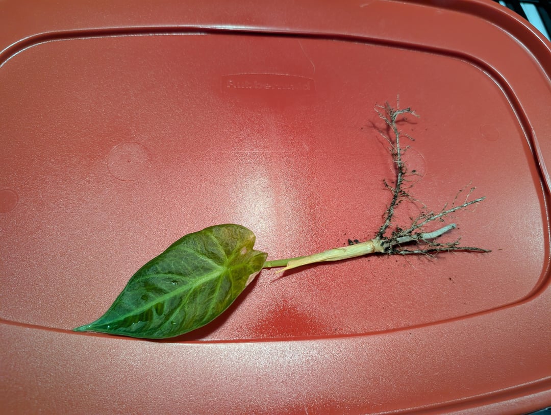 Alocasia scalprum first pic, in a very tentative state, fresh outta the corm. i would get it in leca quickly.