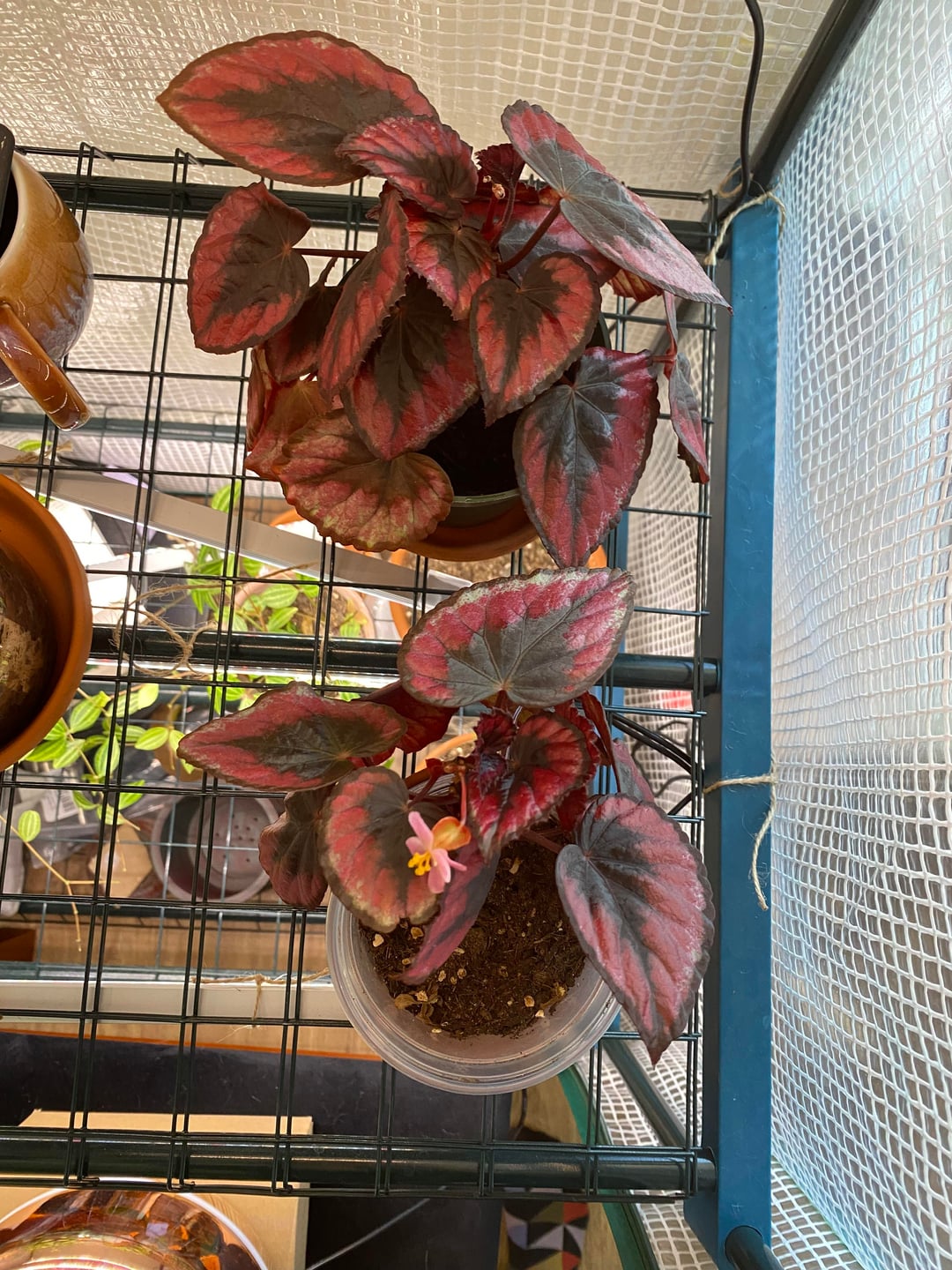 Lastly, a little polka dot (?) cane begonia that shed ALL its leaves when it first came home, but it’s grown a lot and now it seems super happy! It sits under the large one so it gets minimal to no direct light.