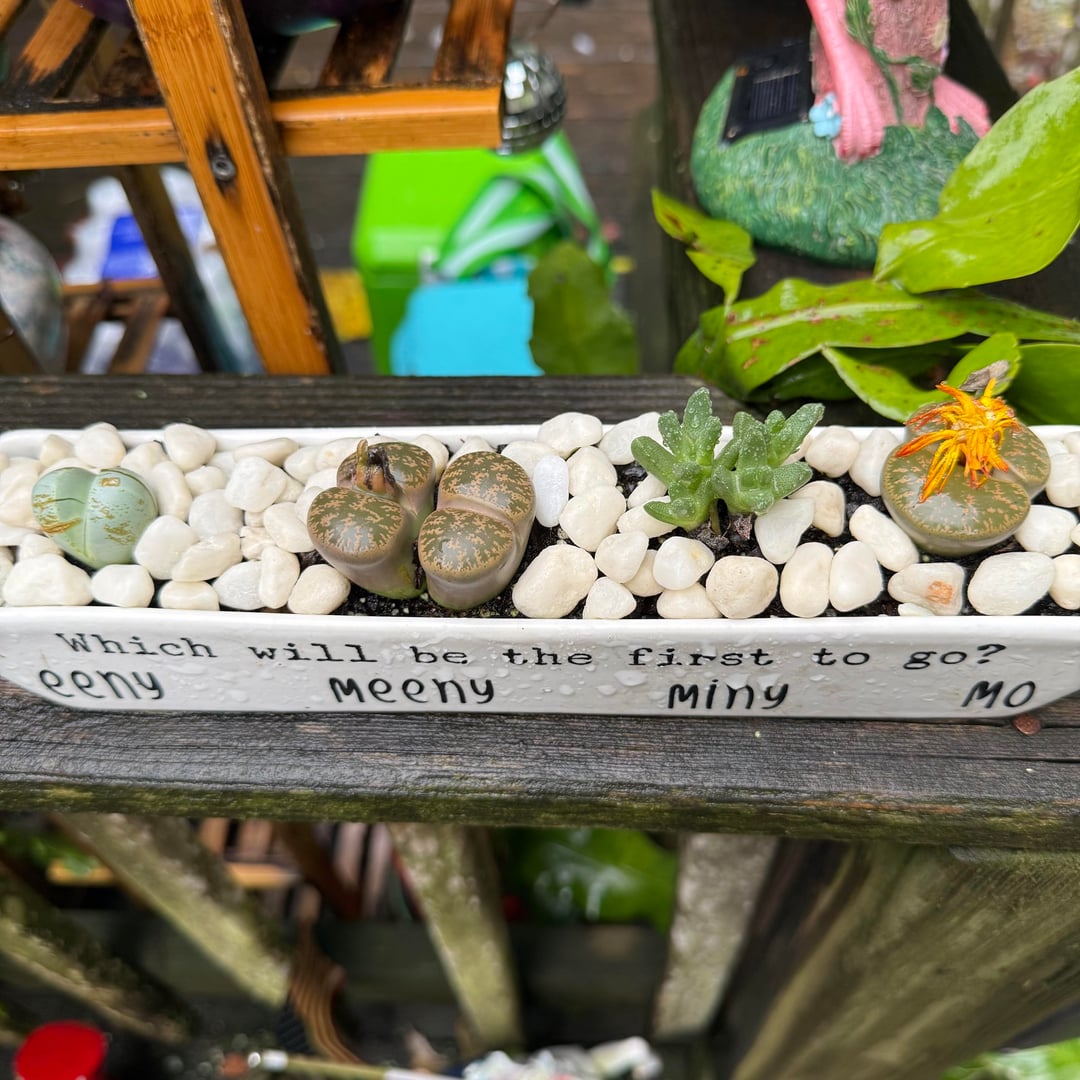 Mine live outside. It’s rained 2.5” in the past week 😬 by Fluffy-lotus606 lithops 6 Comments HarryStylesAMA 1 month ago Oh lord they look like they’re going to explode 😂😂 TimelyYogurtcloset82 1 month ago Are there drainage holes in that pot? zherkof 1 month ago With that soil and that much rain, I’m not sure if matters much that there’s a drain hole. confused_oatmeal_ 1 month ago Oh, its you again 🤓 I see your little friends are about to blow 🤨 Which will be the first to go? 😔😔 gmamacheryl 1 month ago Well, I LOVE the planter!! Adorable! Shanzakwenttotarget 1 month ago Mine live outside as well. I usually try to move them when it rains. Im in a 10b area so not a lot of rain here. I highly recommend changing out your soil mix. I used 2 parts pumice 2 parts perlite and 1/2 part cactus succulent mix. Shook it all together.
