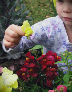 Felder Rushing’s granddaughter is shown snapping snapdragons in his garden. Rushing writes about how the garden can reconnect us with the present and senses in this week’s column. Courtesy photo
