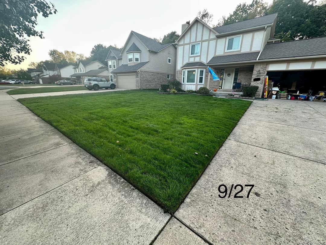 First picture is the day before overseeding. Cut the lawn to about 2 inches. Second picture is the first cut. The overseed was recommended after battling crabgrass and spurge pretty much all year long.