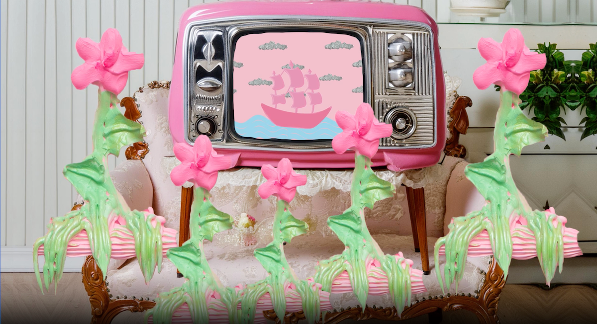 PLEA$URE GARDEN$ is an invitation to step inside Mayorga’s lush and layered candy-colored world. The stop motion animation transforms Mayorga’s blooming flowers, nail charms, and smiley faces into a maximalist dreamscape full of childhood nostalgia, art historical references, and alluring compositions of beauty and leisure. In a style the artist refers to as Latinxoco—a merging of Latinx and Rococo aesthetics—vessels and vehicles glide across painterly landscapes, balloons drift skyward, telenovelas flicker on a living room TV, and lovers dance in slow motion in tactile layers of desire and excess.