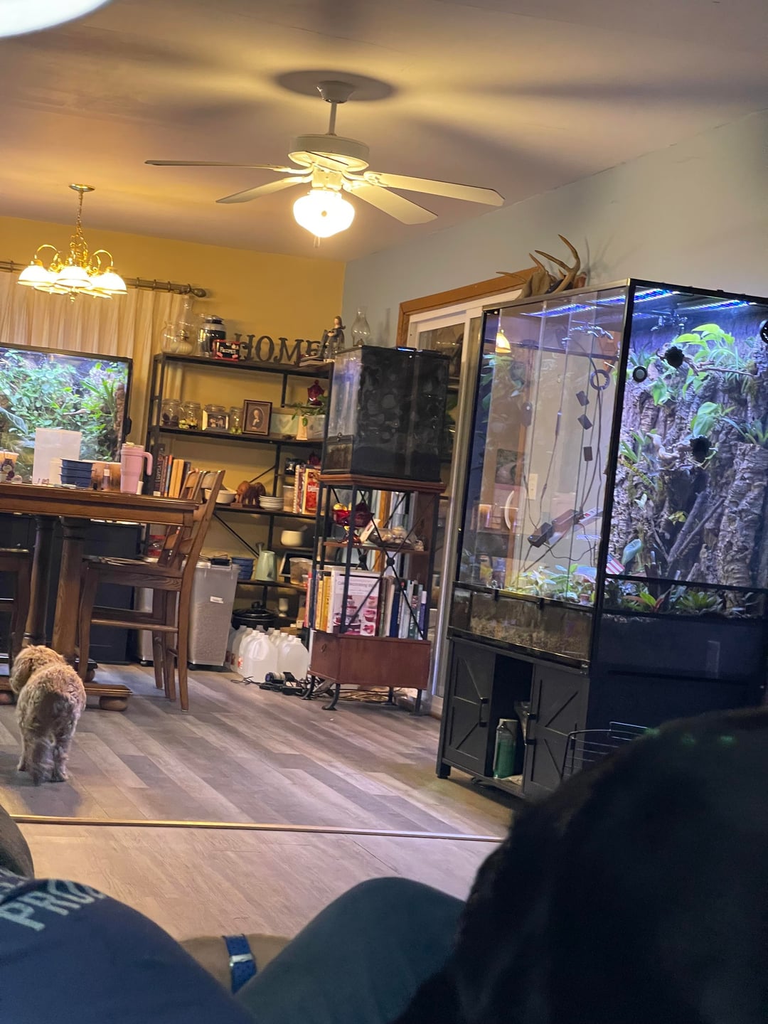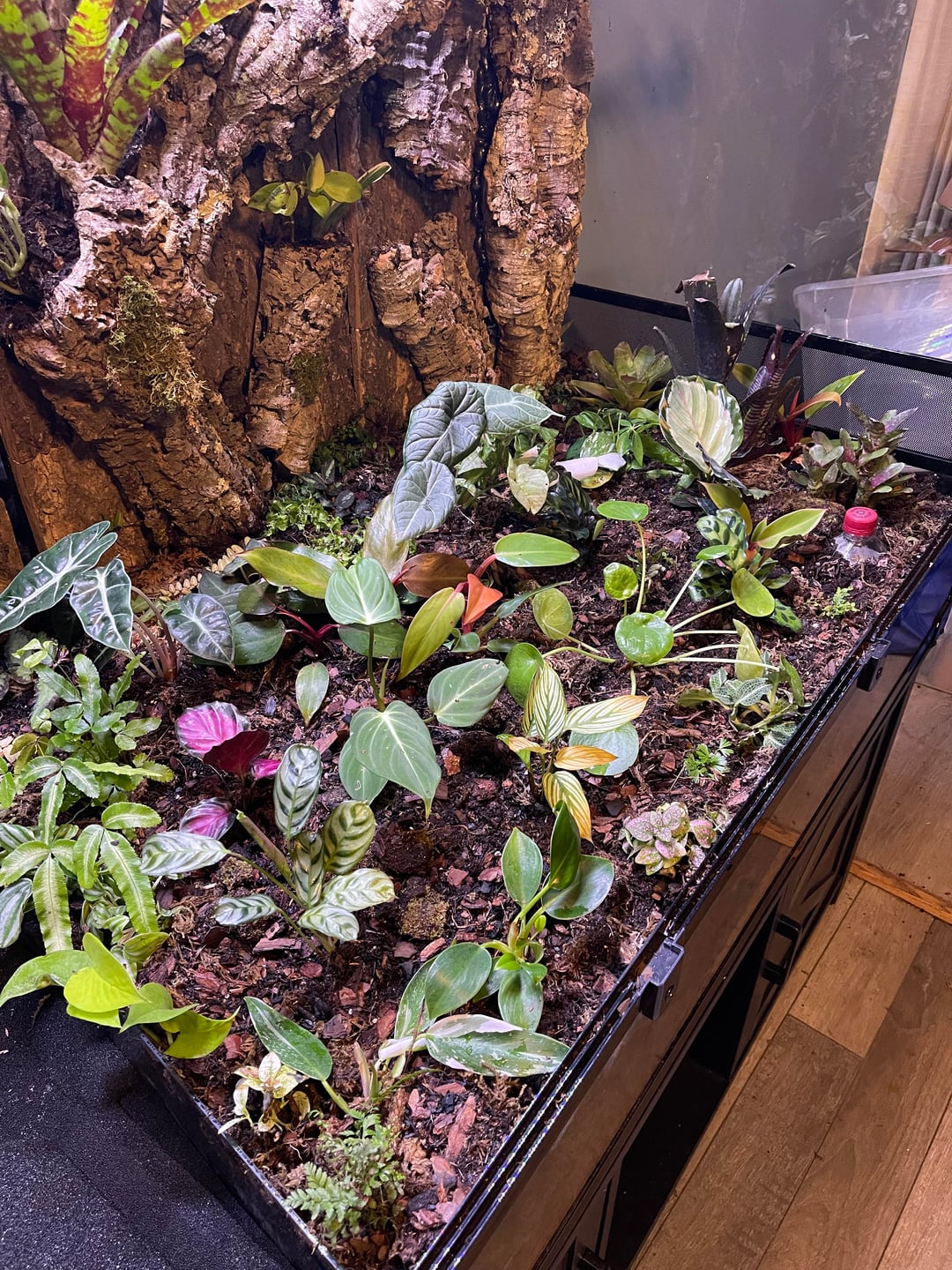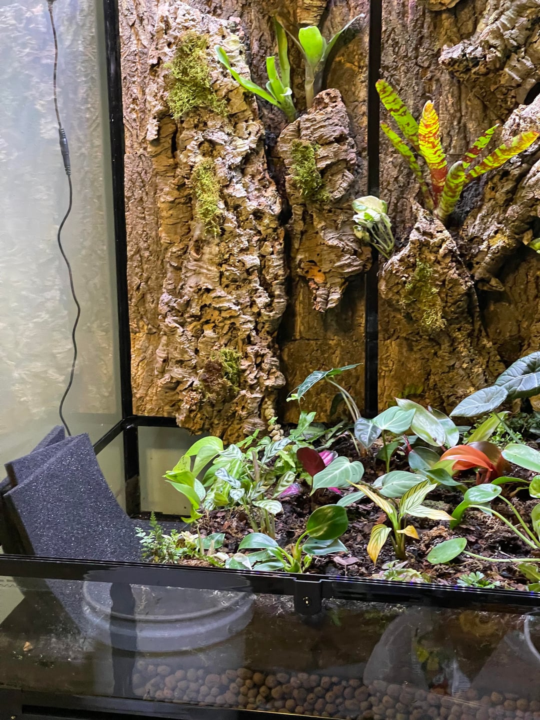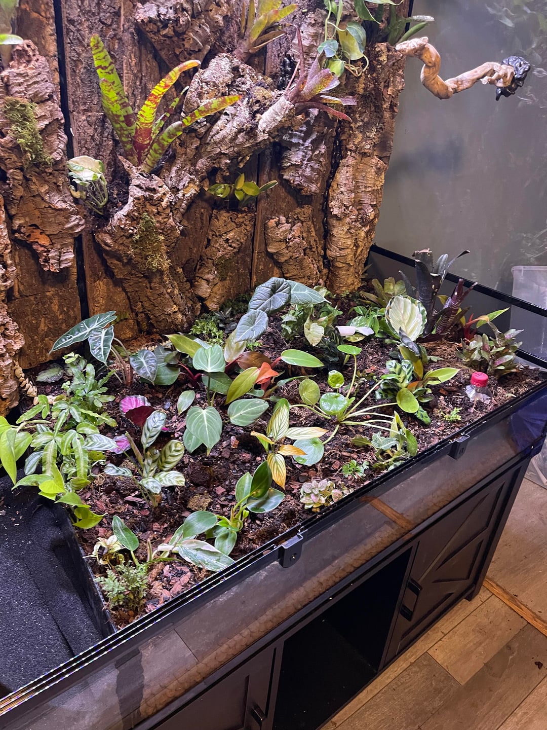You are lucky to have such a large space to utilize so keep utilizing it. The majority of the enclosure is empty. Get some height with branches and use some climbing plants from the bottom on the branches instead. It can be tempting to want to use lots of different plants and colors but some consistency is visually pleasing and lets special plants pop. Some of you plants make me nervous that they won’t last long term because they will get too big and all compete with one another. As the other comment mentioned, I have heard about water being very bad for dart frog habitats. I haven’t been fortunate enough to have the space for dart frogs yet but I do research for when that day comes and it’s definitely not recommended. They prefer dry feet and wet backs, meaning they like to stand on dried leaves and get moisture from the air not from pools of water. Such a large tank would be so great for something that climbs if you put branches in it! Keep going, it’ll be great!