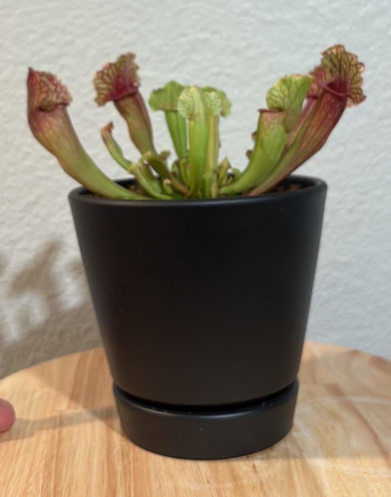 Got this “white wizard” sarracenia a few months back and it’s been doing really well. Couple small pitchers a month and a large one every two or so. It’s helping solve my fungus gnat problem, too— so it eats good.