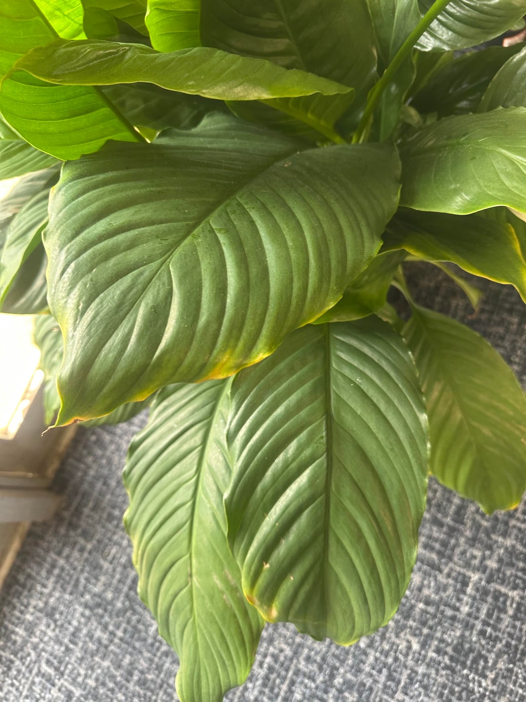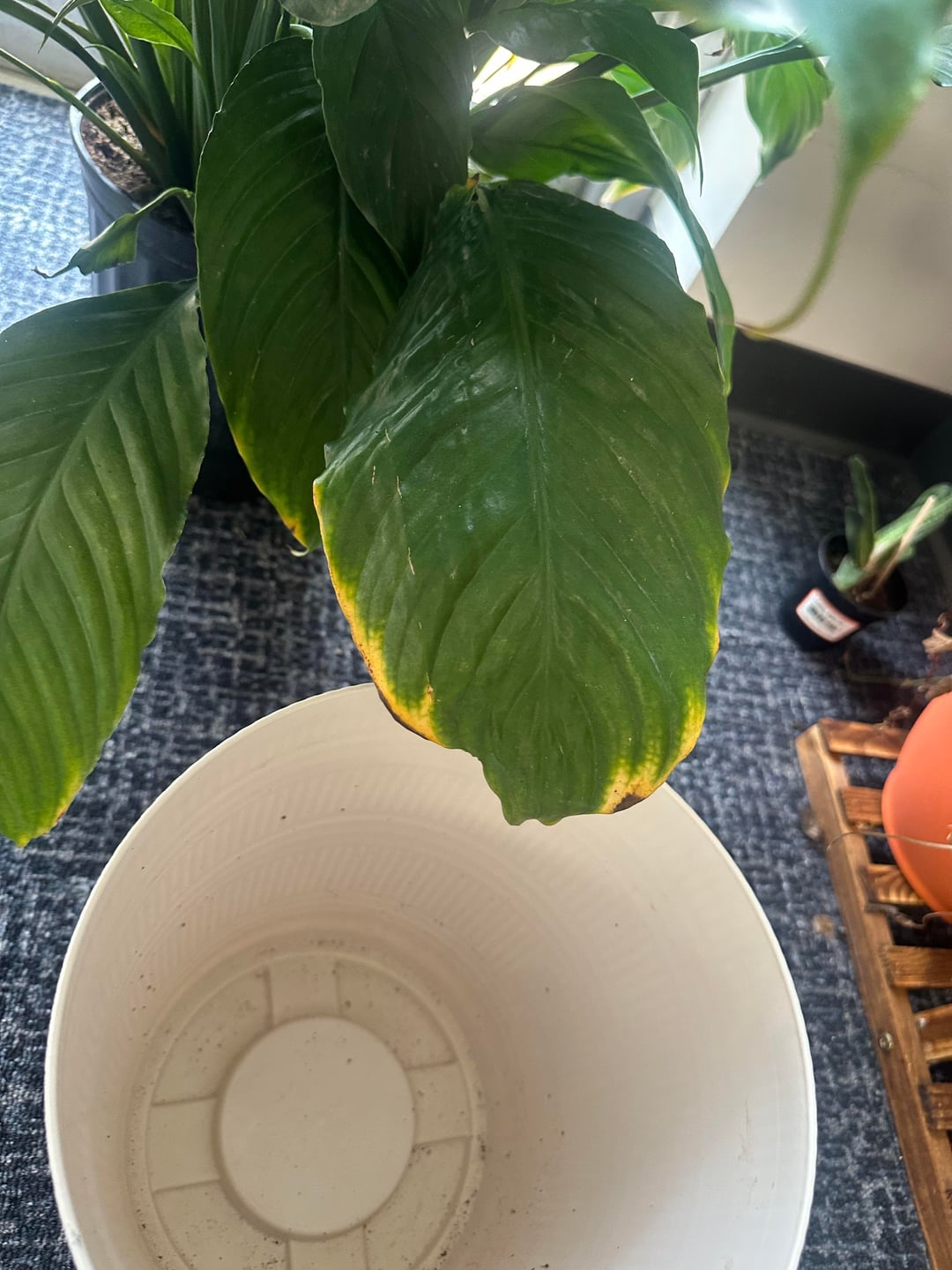 Occasionally lately she’s yellowed out the very small underside leaves and dropped them, but rarely— now suddenly she’s getting a yellow edged leaf with brown furthest edge.