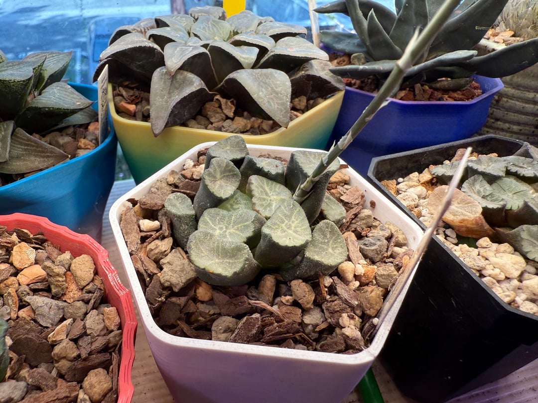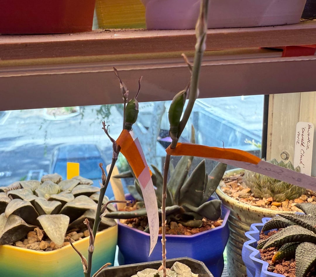 I have rarely had a pair of maughaniis match up. Multiple times over the last two years, one of the inflorescences went limp before flowers opened. But this time, they just barely matched up with the last flowers on one and the first flower on the other.