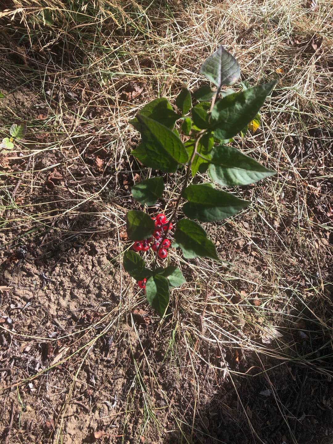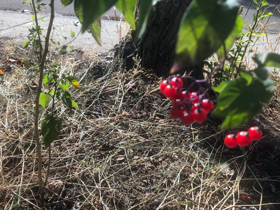 That is definitely bittersweet nightshade, Solanum dulcamara. The species often has interestingly shaped leaves, with little lobes at the base. You can see those in your first pic. The growth habit (woody vine), inflorescence shape (complex/branched) and appearance of the berries all match the species perfectly. You can look at [pics of the species on iNaturalist](https://www.inaturalist.org/observations?taxon_id=55620) to get a feel for what it looks like. You don’t need to be worried about it. People often intentionally plant things that are more “dangerous” than this is without giving the toxicity a second thought (ie. oleander, castor bean, foxglove, etc). Bittersweet nightshade is safe to touch, and is fine to grow around edible plants (including crop nightshades like tomatoes or peppers). As long as nobody is eating the plant, there’s no danger.
