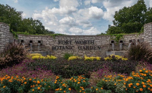 On Oct. 5, 2023, the entrance sign of the Fort Worth Botanical Garden surrounded by marigolds and wildflowers commonly found in Texas. These flowers greet the visitors and are highlighted repeatedly around the gardens. (AP Photo/Analise Wachtel)