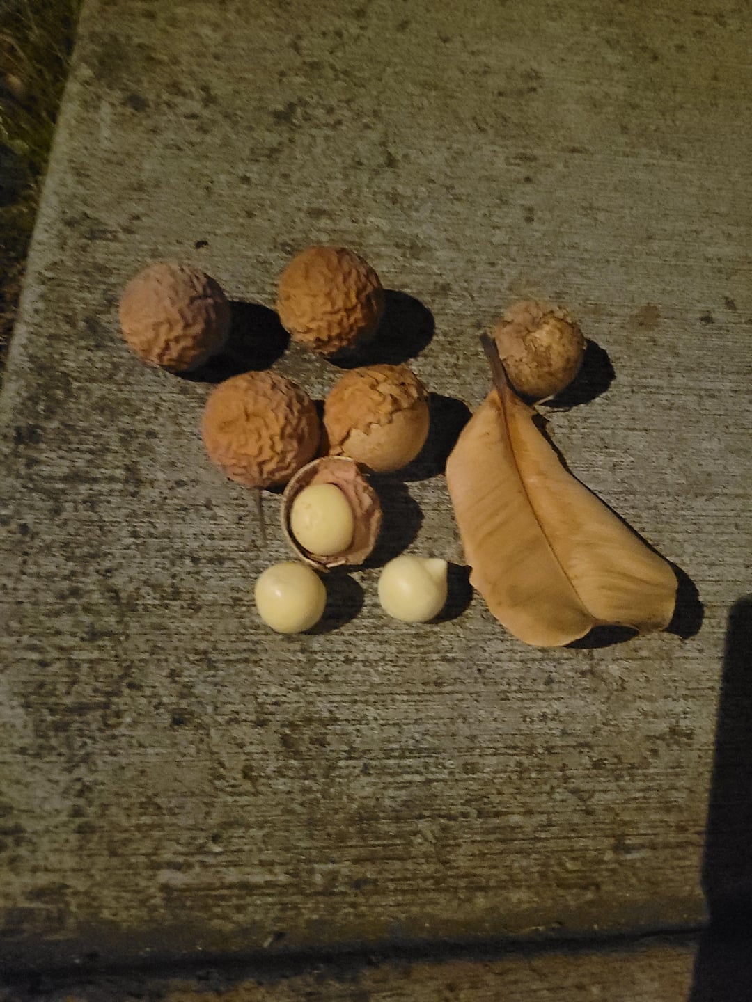 I recently moved to Hawaii (Oahu specifically), and there are several of these nut-producing trees around the neighborhood. Its hard to tell in the picture but they're growing in clusters on the tree. I want to believe they're macadamias, but from what I gather macadamias have a very thin, smooth shell, while these are rather thick with the smooth exterior covered in what I can only describe as a crinkled, papery-like material. The nuts themselves are about 2cm long. I'd appreciate an ID on them!