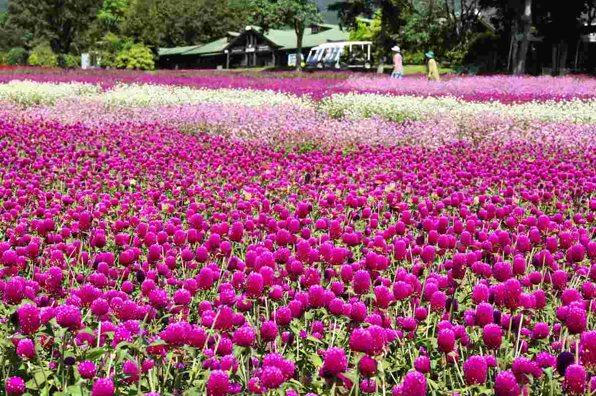 Visitors were delighted by fields of purple, pink and white globe amaranths at the Kuju Flower Park in Taketa, Oita Prefecture.