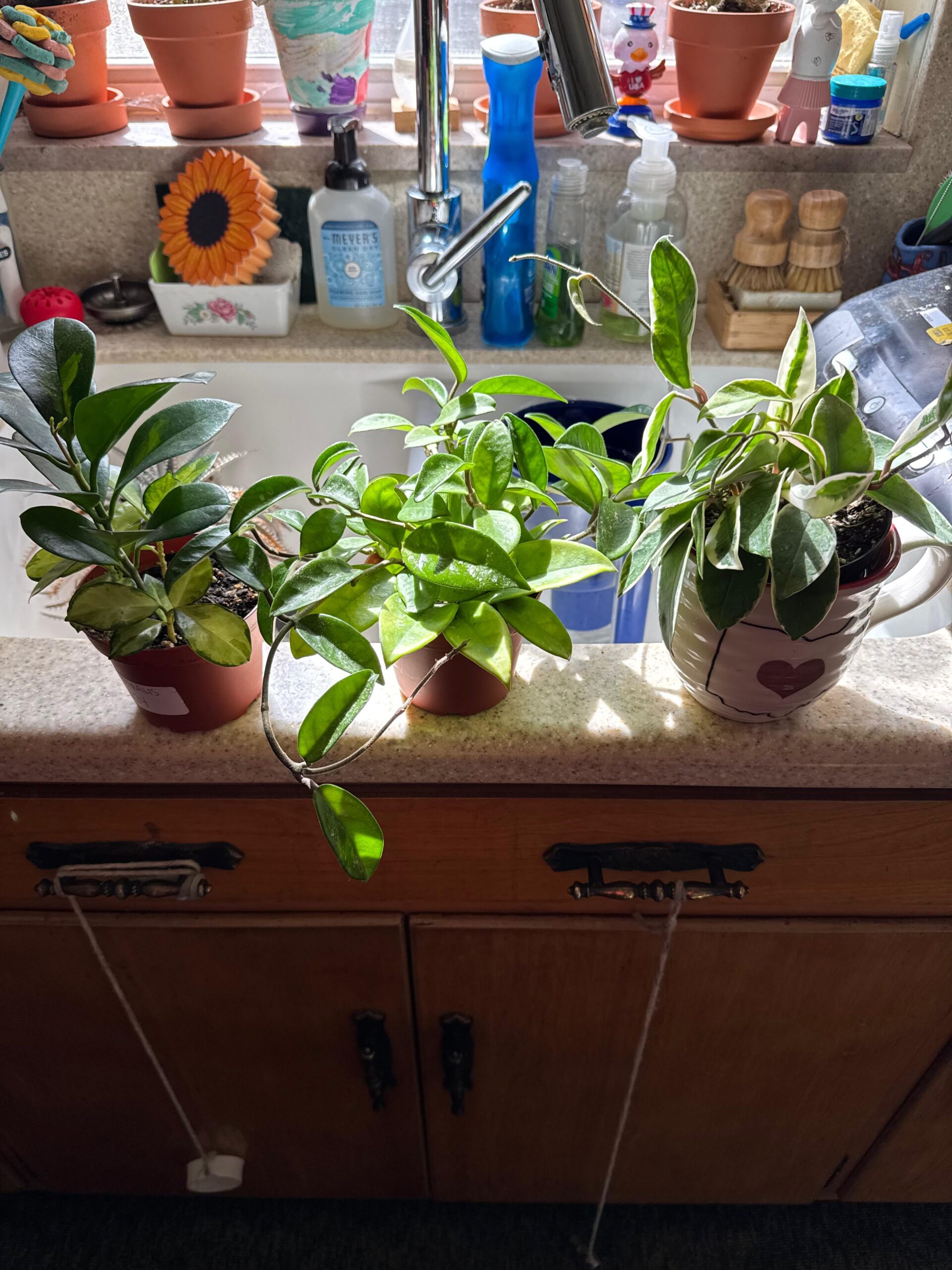 I bought these 3 Hoyas in the last 3 weeks. The left one is marked as Hoya Australis and the right is marked as Hoya Krimson Queen. The center Hoya wasn’t marked but they told me it was also a Hoya Australis. The leaves on the center plant are much thicker than the others. I’m new to Hoyas and I came across this page and fell in love with everyone’s beautiful plants. When do you transplant them from the container they came in and what type of potting mix should I purchase? Thanks in advance!