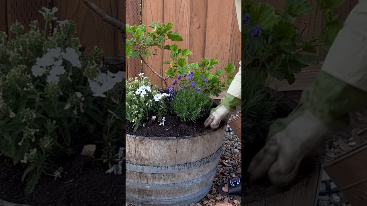 This was my half wine barrel last year. This was it during the spring. And now this is what I’m planning for fall. I planted English lavender, verbena, and deranium. I also planted Madagascar, periwinkle, geraniums, verbina, and candy tough.