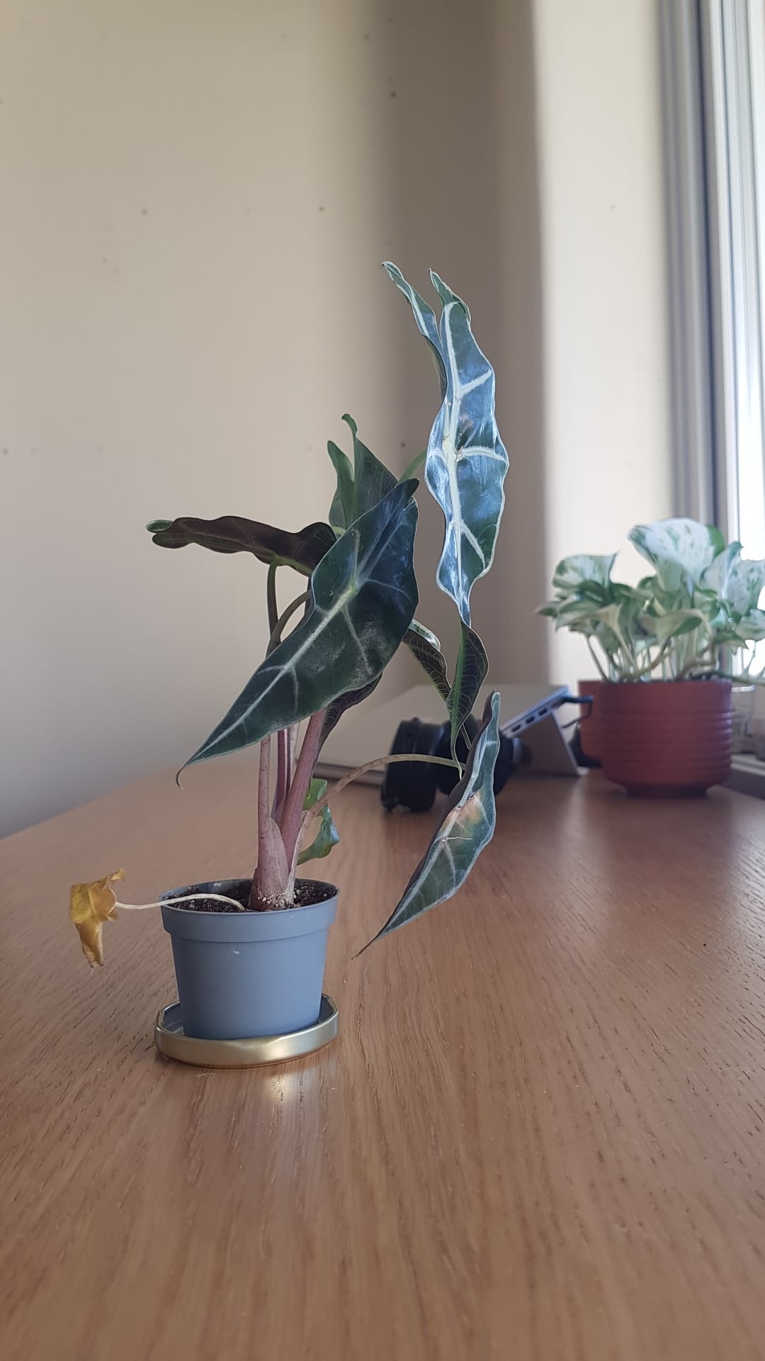 I actually think it’s probably reflecting off the shiny table and the leaves are bending to catch the reflection, combined with them being top heavy from leaning one direction in a small pot. The yellowing leaves are just older leaves dying off as it puts energy into making new leaves which sprout from the middle.