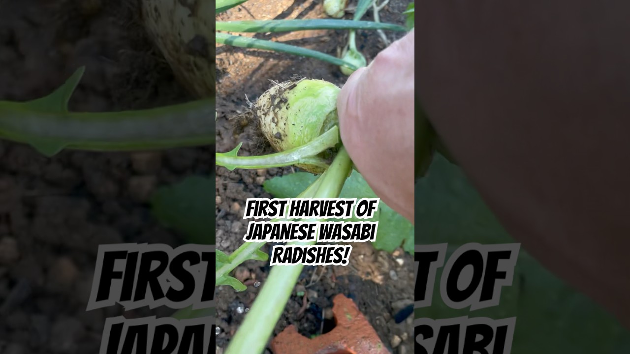 What a beautiful late May day out here in the garden. You’ve been seeing me pull my purple plum radishes. Well, they’re almost done. Check this out. The Japanese wasabi radishes are ready to pull. Look at this thing. Let’s see what it looks like. Oh, he’s down in there good. Oh, look at that radish.