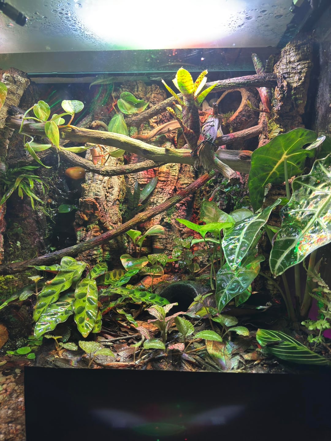 I don’t have UVB lighting yet, so I’ve been dusting their food with calcium powder in the meantime. The enclosure stays within ideal temperature and humidity ranges, and I’ve added lighting to support healthy plant growth.