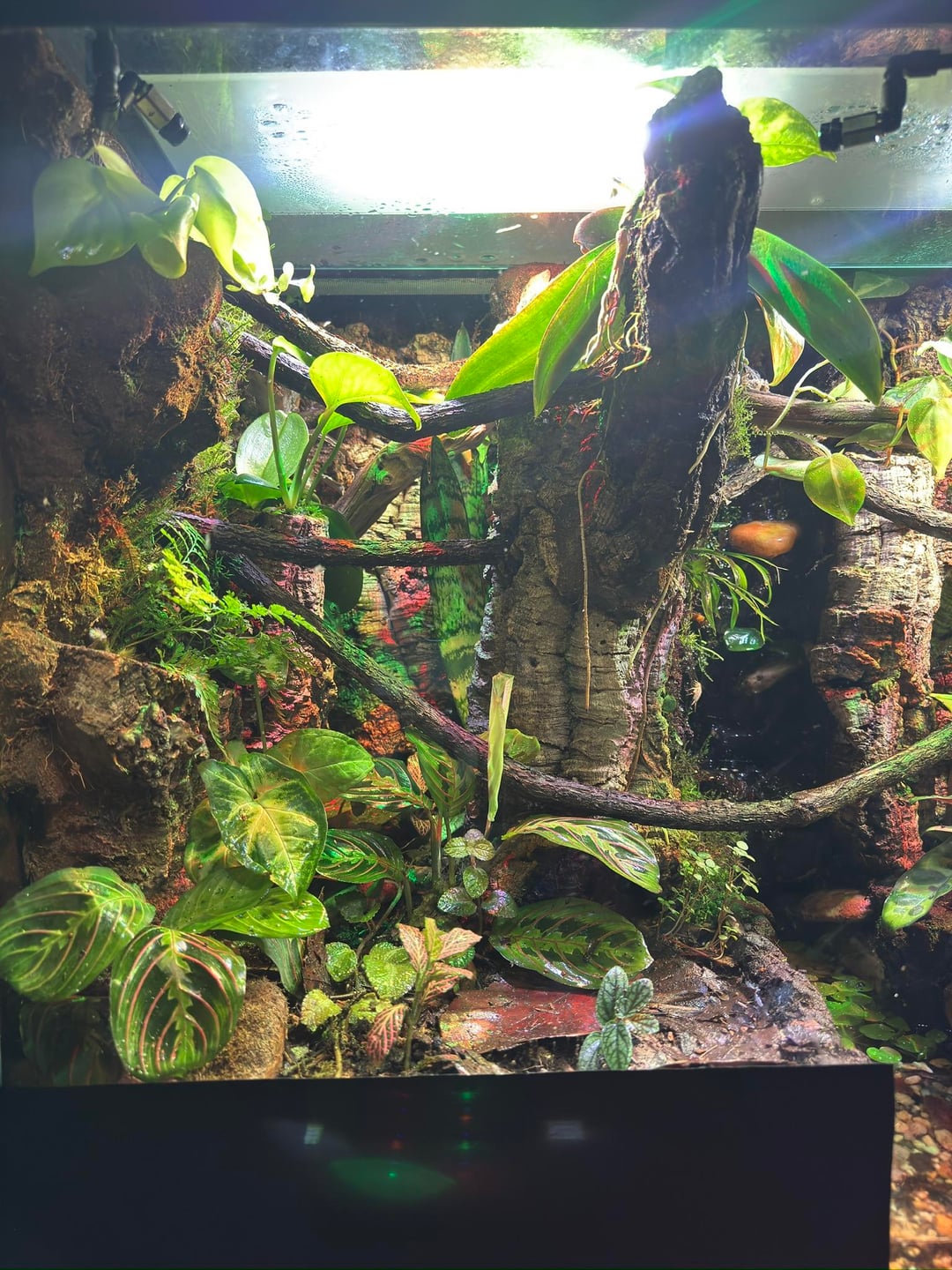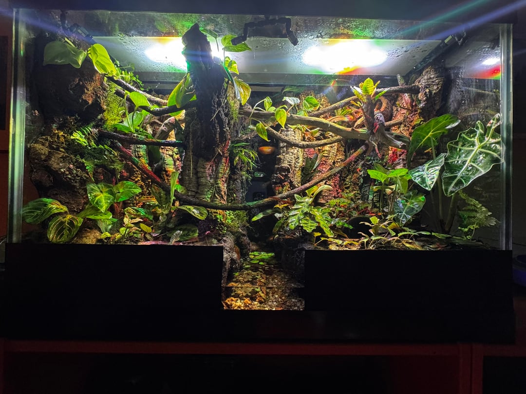 The frogs have plenty of climbing opportunities and hiding spots among the plants, wood, and leaf litter. For hydration, I’ve set up a full waterfall system that flows into a central river area, plus a custom misting system to maintain humidity and keep them comfortable.