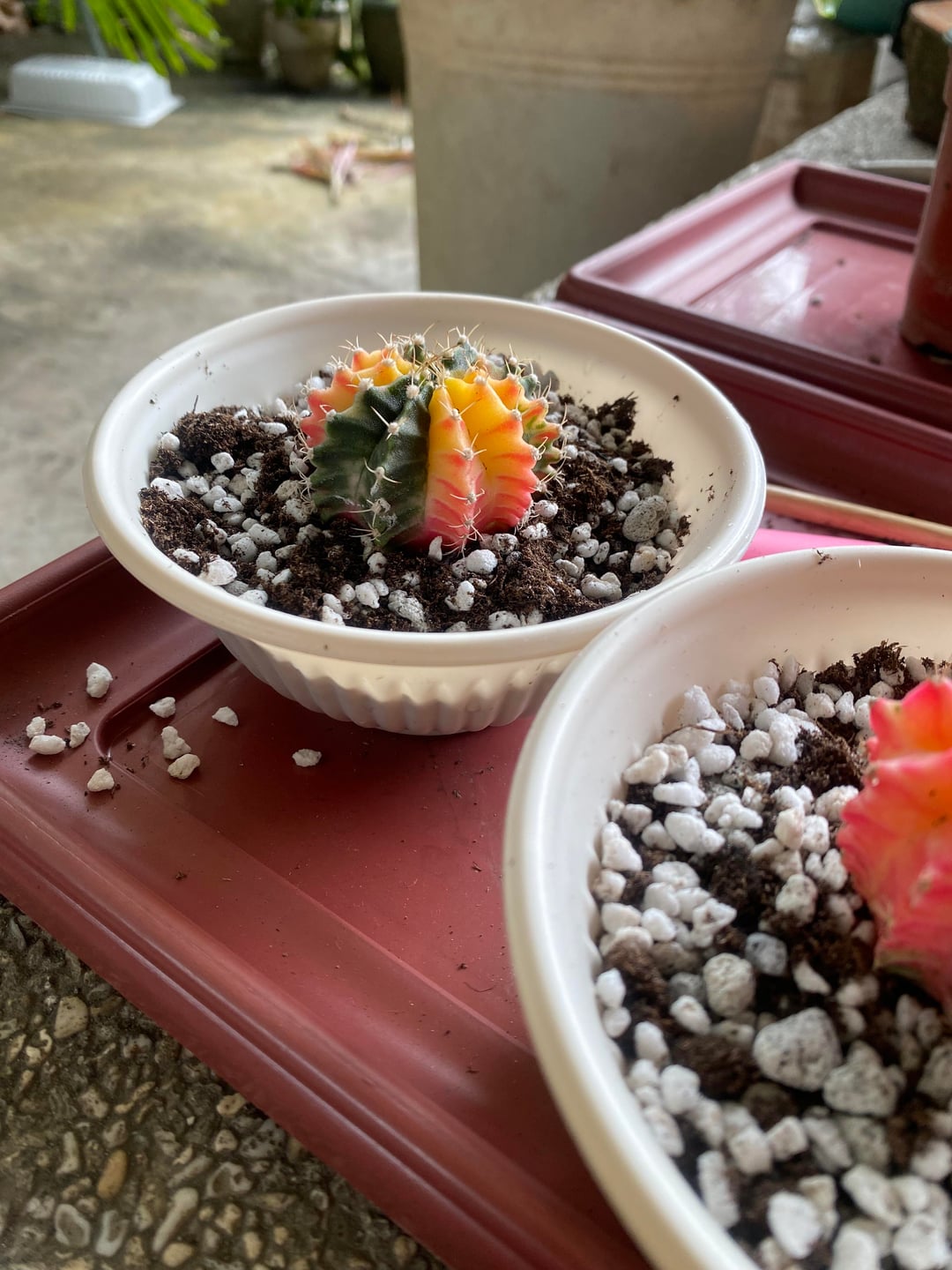 I unfortunately had to quickly and haphazardly plant them in these tiny bowls that I poked drainage holes in because I’m recovering from an elbow injury and I couldn’t quite maneuver myself properly. I also couldn’t lift the bag of the akadama I ordered. The mix is about 60% inorganic (pumice and perlite) to 40% soil with mostly peat moss as I heard they liked acidity. I haven’t watered them as advised in my earlier post.