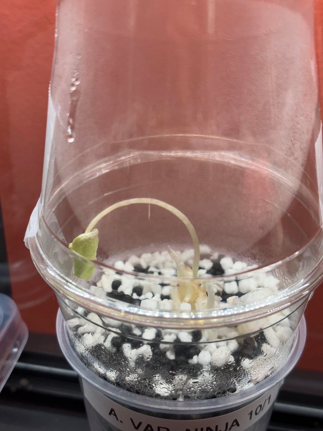 It’s not looking too hot is it?? It was in transit for 8 days. I deflasked it, washing all the agar off via sink stream, let it soak in a hydrogen peroxide/water solution for 5 minutes, dipped roots in Bonide Rooting Powder, & then placed in a 50/50 perlite stratum mix inside a self watering cup. I keep her in a grow cabinet, under Barrina T5 Lights. 7 feet away from a southwest facing window.