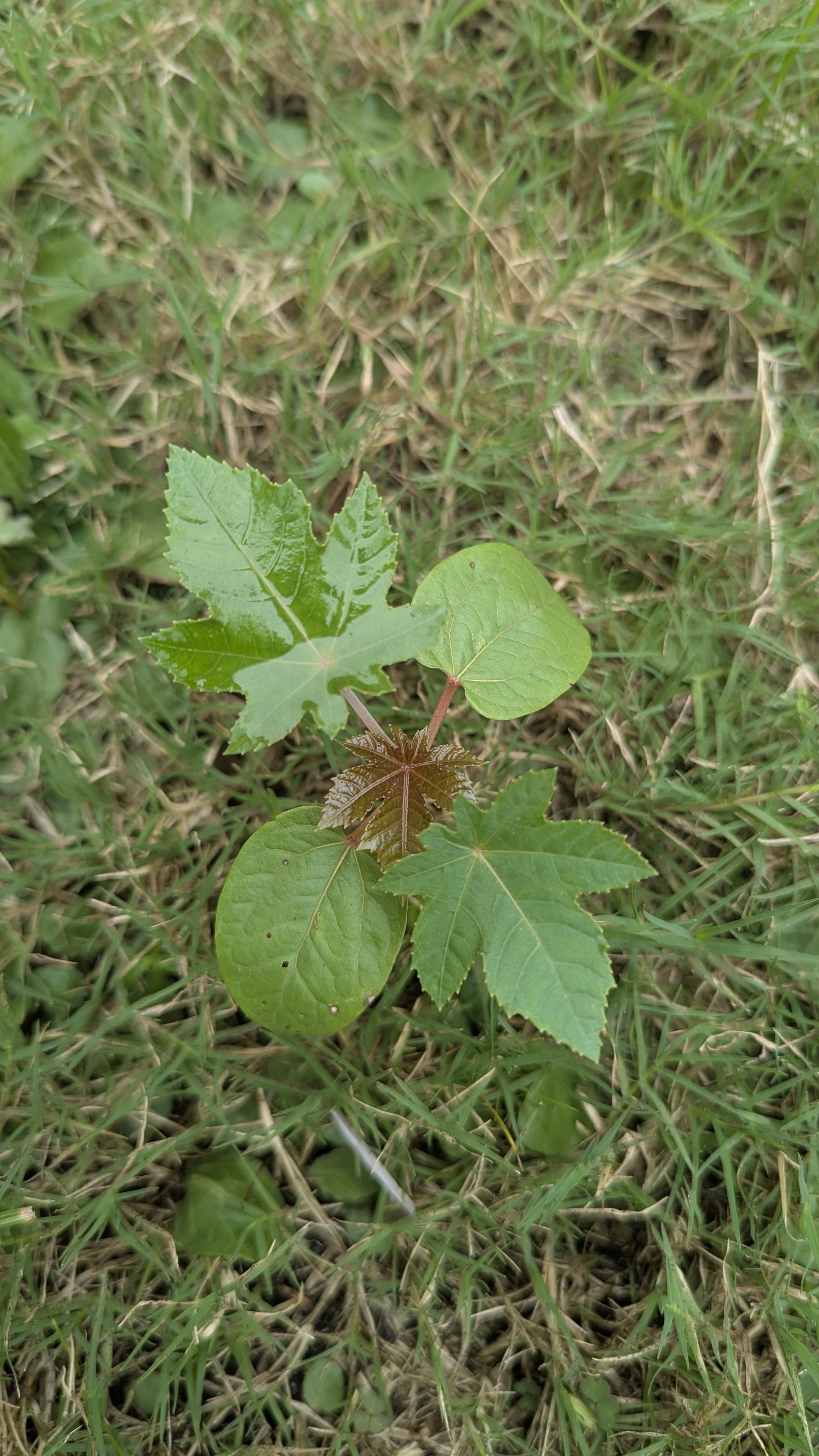 I think you’re looking at a castor bean sprout. If so, the two paddle like leaves are called cotyledons. They come squished inside the seed and are basically the first solar panels of the plant.