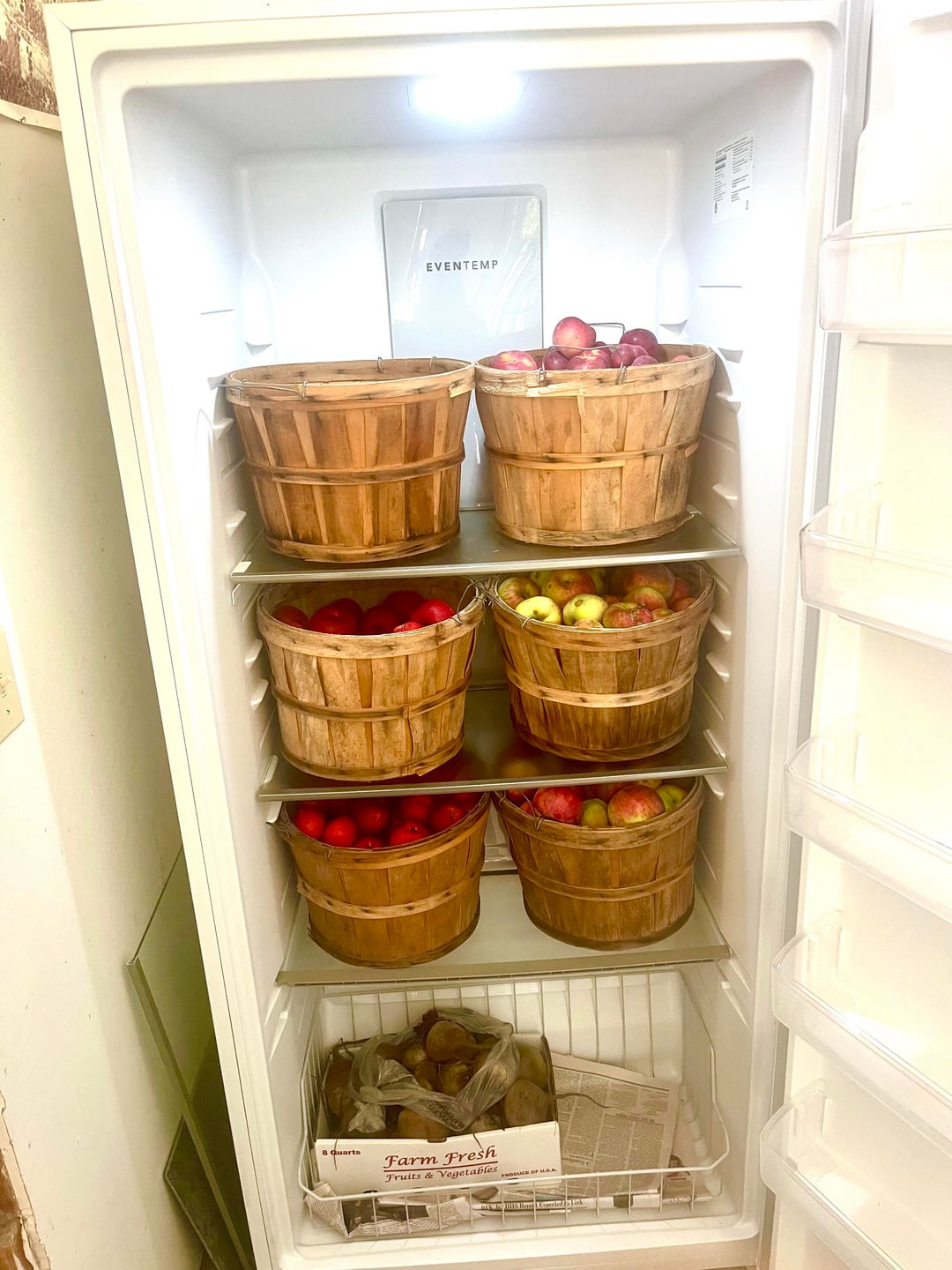 We usually pick these Winesap apples mid October. They are great keepers and store for months. This variety has been grown for over 200 years in New England. These are standard size tree in our no spray orchard. We purchased a restaurant style refrigerator ( no freezer) to store fruit and some root crops for winter use. The frig stays at 32 degrees F. for optimal storage. Vermont zone 5B