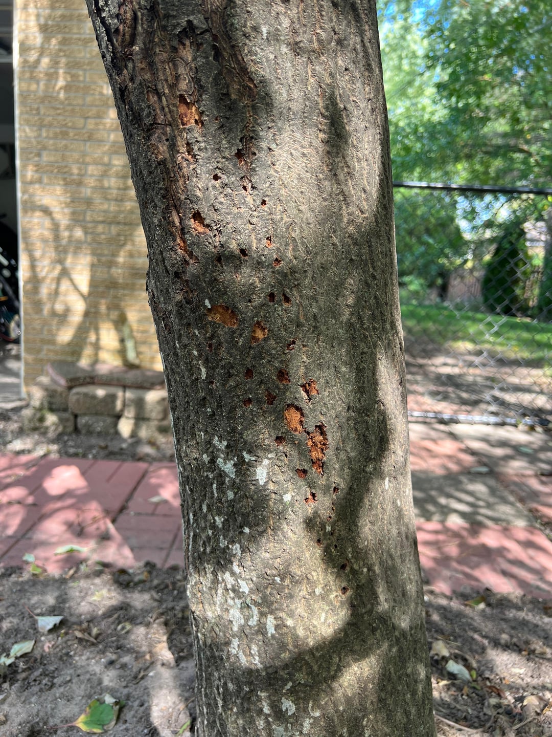 However, holes like that are almost always woodpeckers going after insects under the bark. The insects in your tree aren’t necessarily the cause for its decline though. The insects under the bark might be there because that tissue was already dead and was a great home for them to set up shop. We’d need to understand more about this tree before making a definitive conclusion as to why it got to this point including lighting conditions, soil conditions (moisture, composition, nutrient levels etc ..) planting depth, etc …