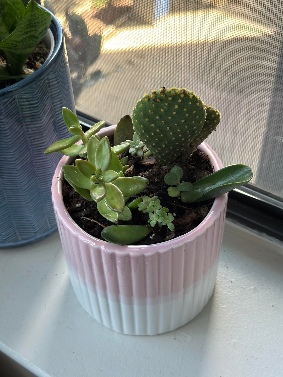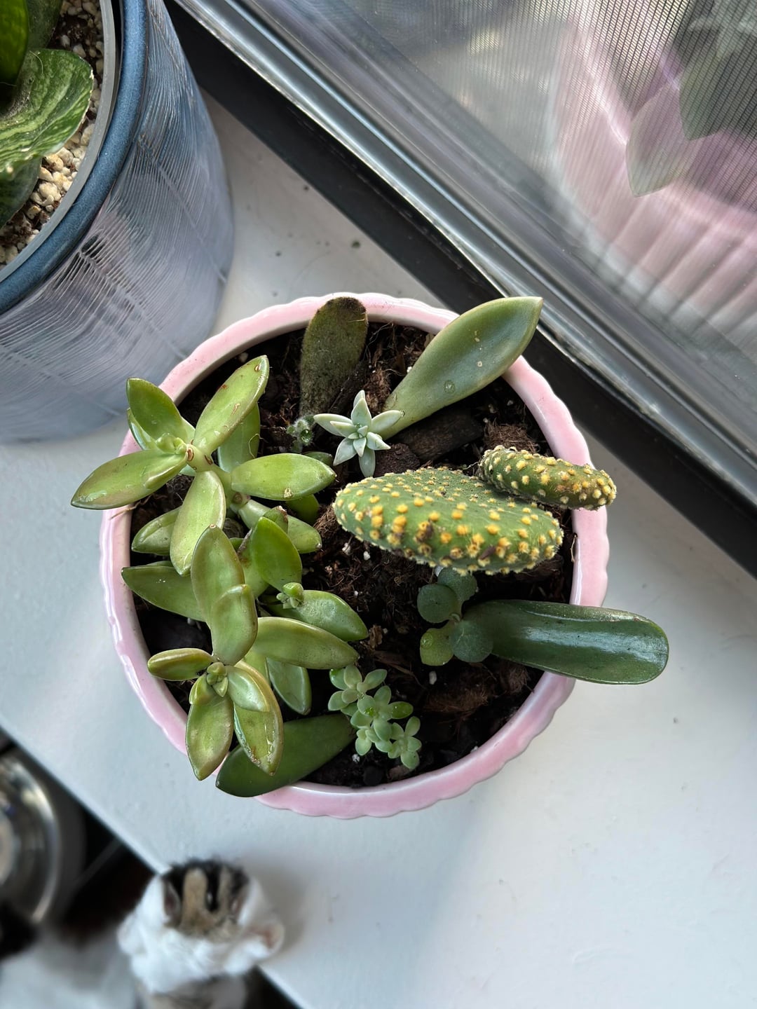 I’ve been propagating some succulents I’ve collected from random big box stores for a while now. Decided to combine them with a larger succulent and cactus. The plan is to find a wider pot eventually. Does anyone know what succulents they are?