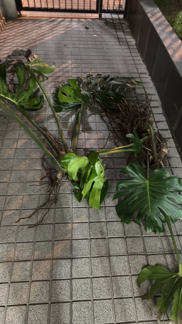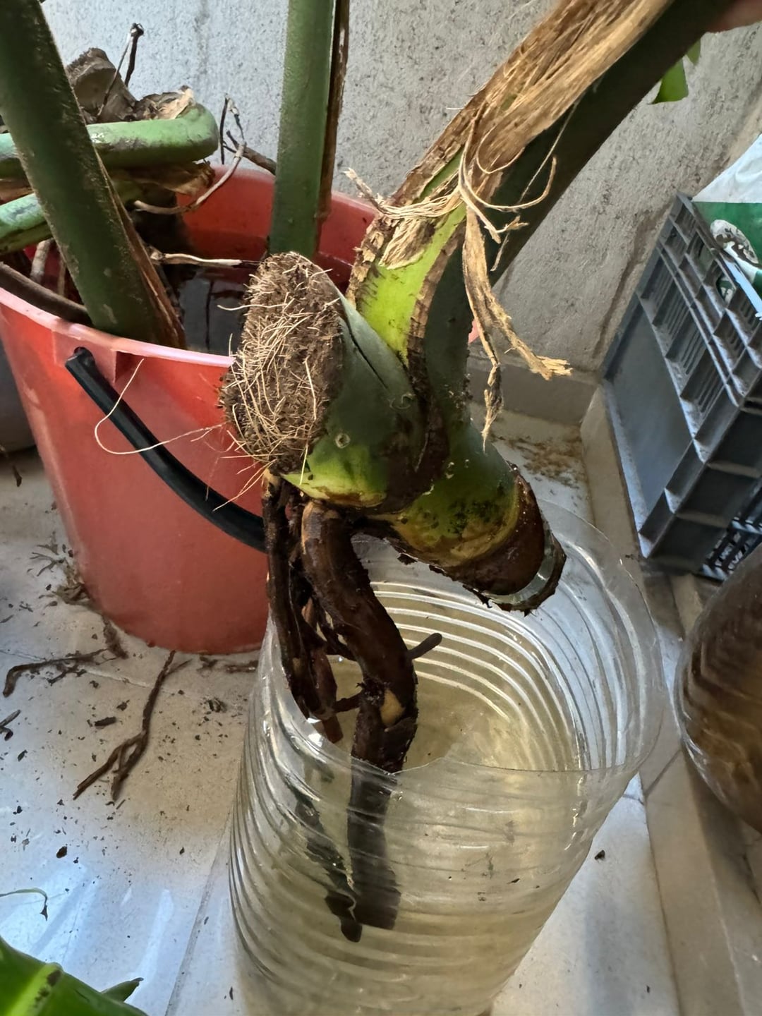 So, i was walking back home last night and a house close by chopped down into pieces , along with other plants, a huge monstera it had on its garden, i managed to salvage these 4 trunk pieces last night and first thought i had was to put them in water. The stems are ok, but some leaves are partially broken. The trunks are all full of aerial roots.