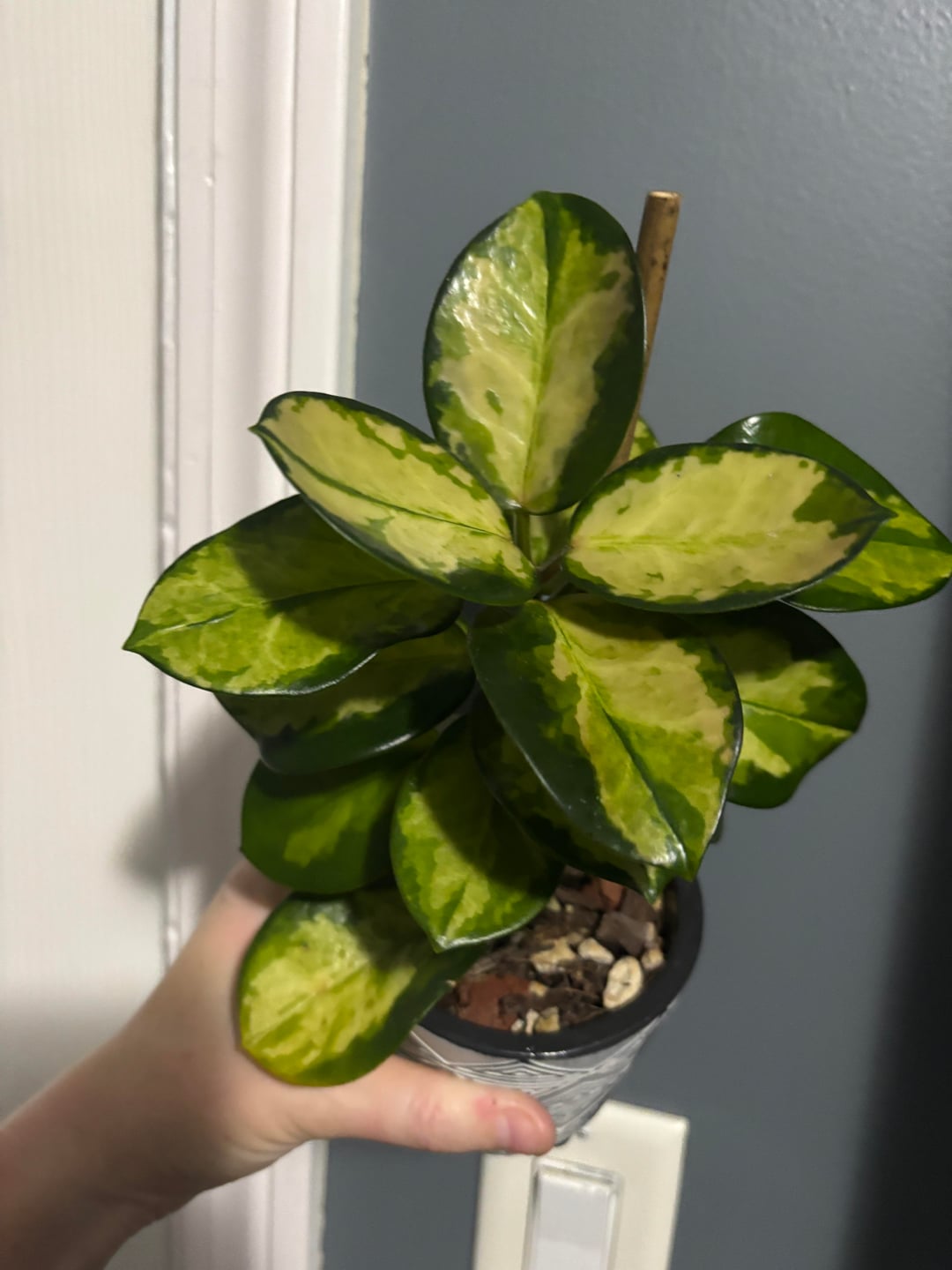 I am hoping to encourage vining – she currently sits about 8-10 inches from a soltech grove light for about 10-12 hours a day. I do not let it dry out completely and fertilize at 1/4-1/2 strength with super thrive every watering. I also occasionally fertilize with this random Hoya “bloom boost” fertilizer ( even though I’ve never had any of them bloom ever ) maybe every 3rd watering?