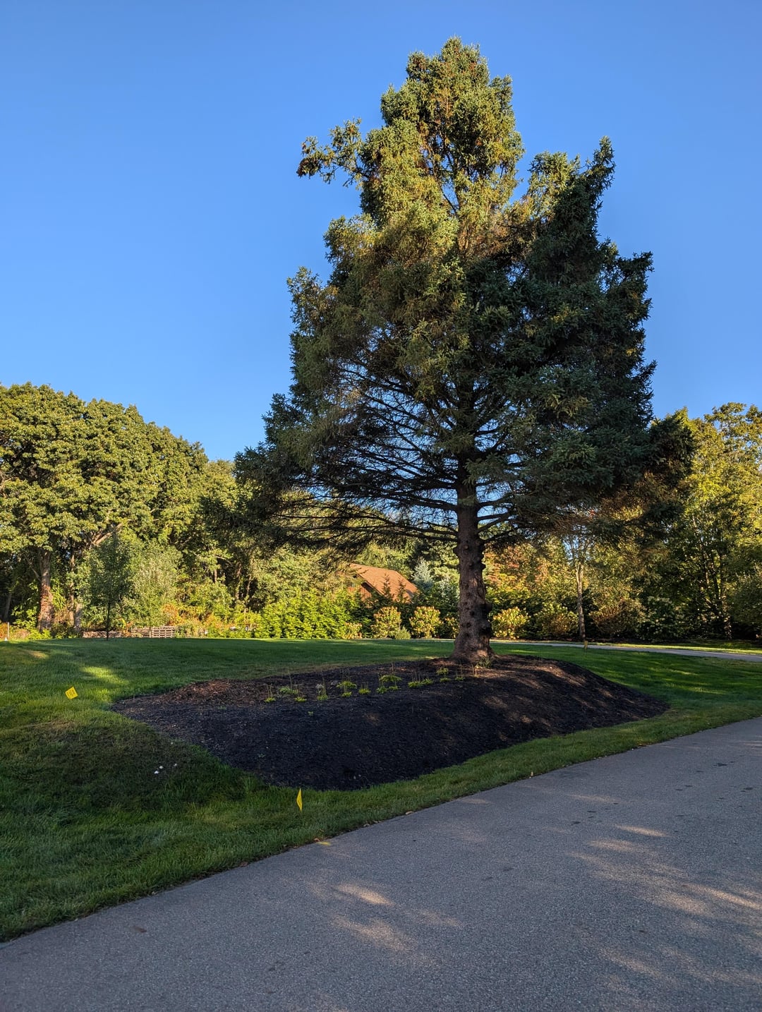 Sadly, this spruce has to go, due to needle cast. There was a second spruce has already been removed. I would like to plant evergreens and possibly some perennials, but I don't want to block the view of the house from the street. The existing bed is about 30 yards long and 10 yards deep, with approximately 2 of those yards are on a steep slope. The existence of needle cast in the soil limits options to plants that are not vulnerable this fungal disease.