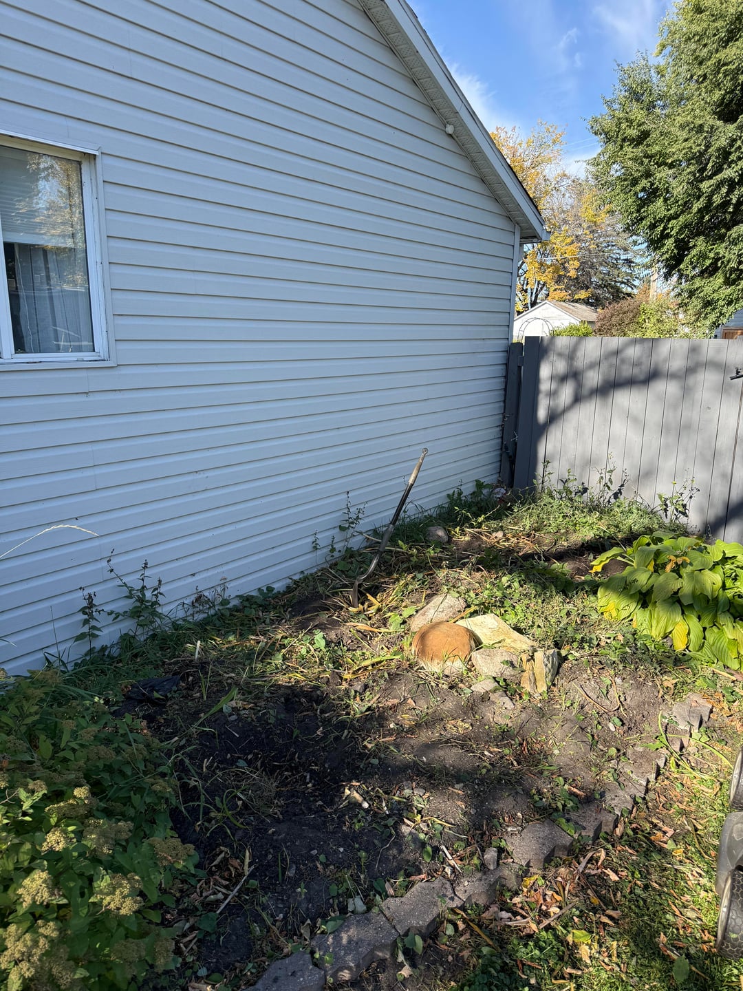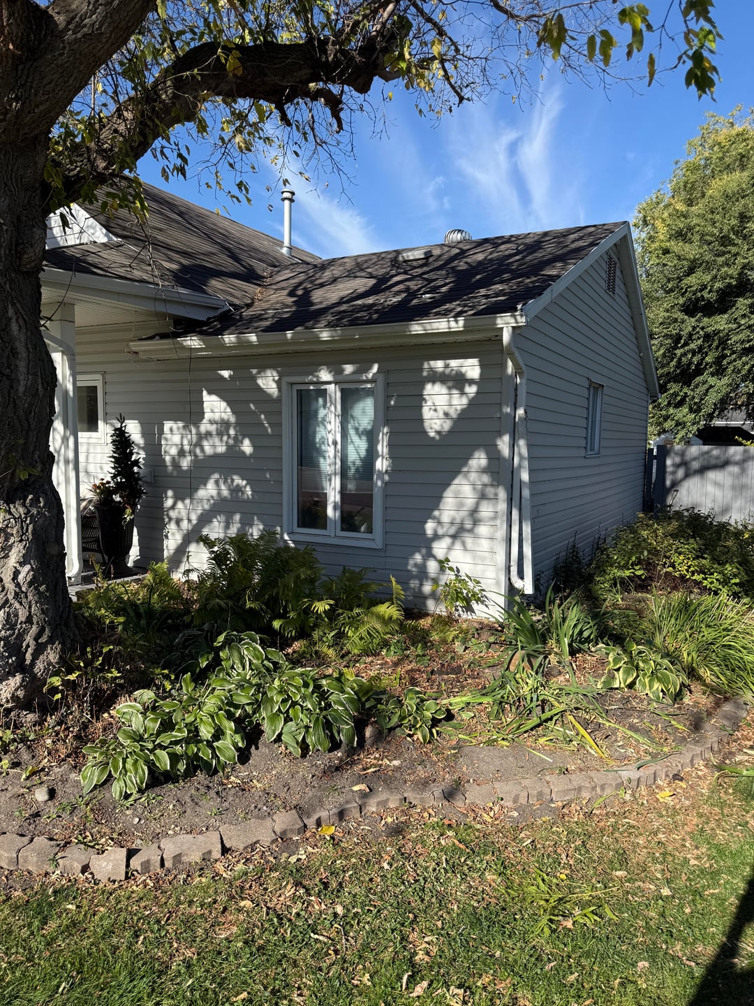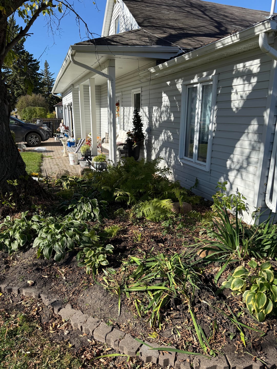 So my auntie, who loves landscaping and planting trees and shrubs etc, wanted some black top soil added to her front flower bed. The thing is she wanted all 4 yards put in here and to build it up so that the snow melt wouldn’t come into her basement. She wanted it built up so much and she even said “ I want it to be at least a foot higher on my siding”.