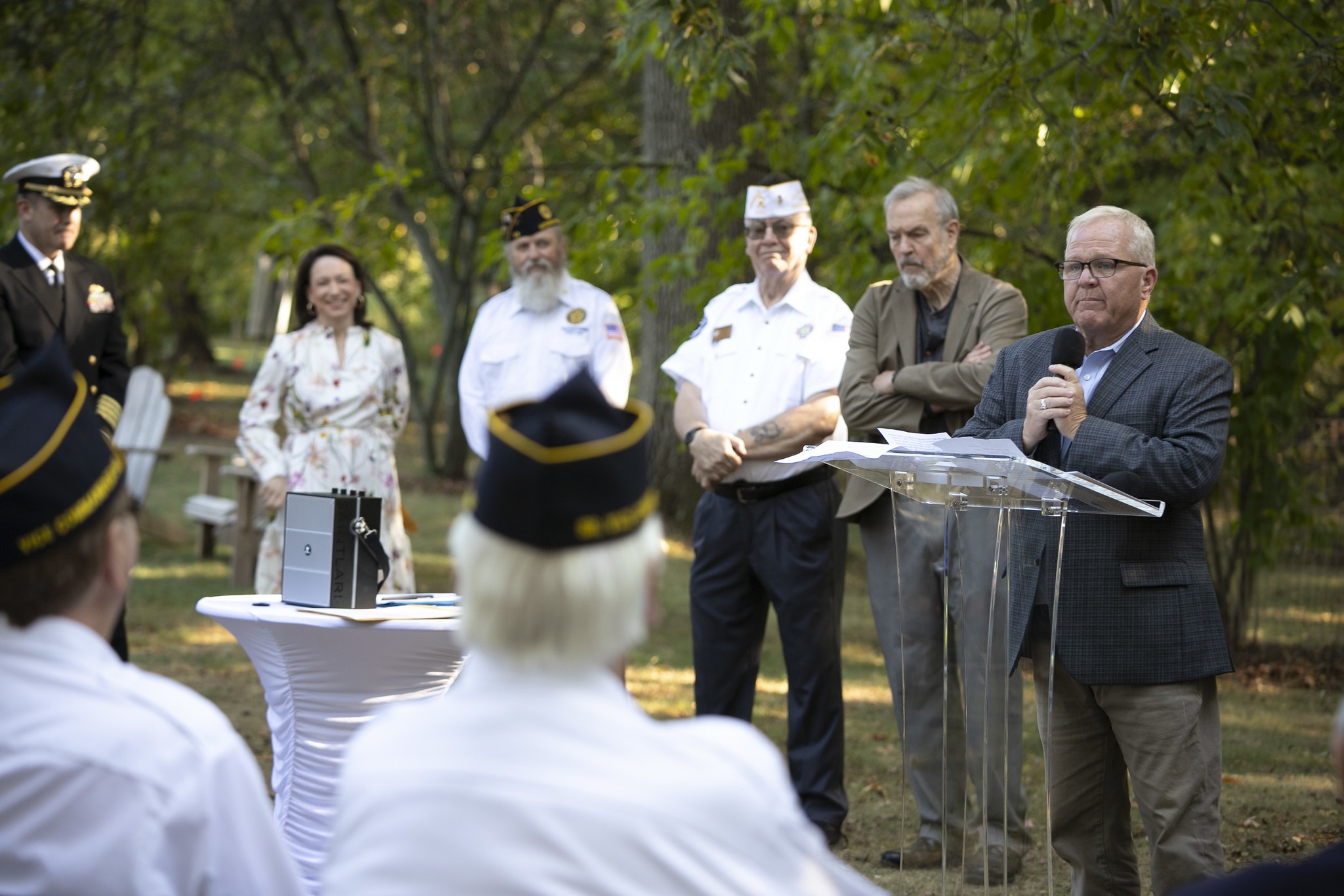 Commissioner Douglas Cabana speaking at the ceremony. Pictured in the background (l-r): Rob Hughes, retired U.S. Navy captain and board member of Veterans Valor; Asm. Aura K. Dunn; Commander James Koons of American Legion Post 59 of Morristown; Tom Murphy, veteran and local artist; and Will Draper, executive director of Veterans Valor.
