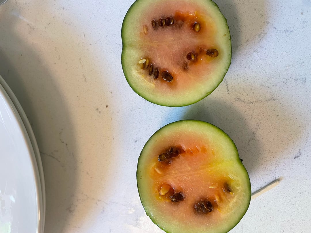 This is the only watermelon that survived pests. I harvested because its vine dried out. The only other one I had left was preyed upon by all the critters in my garden before I could get to it Cannot understand why it is so small, but it obviously wasn’t ripe. Saving the seeds and trying again next year (planting earlier for sure)