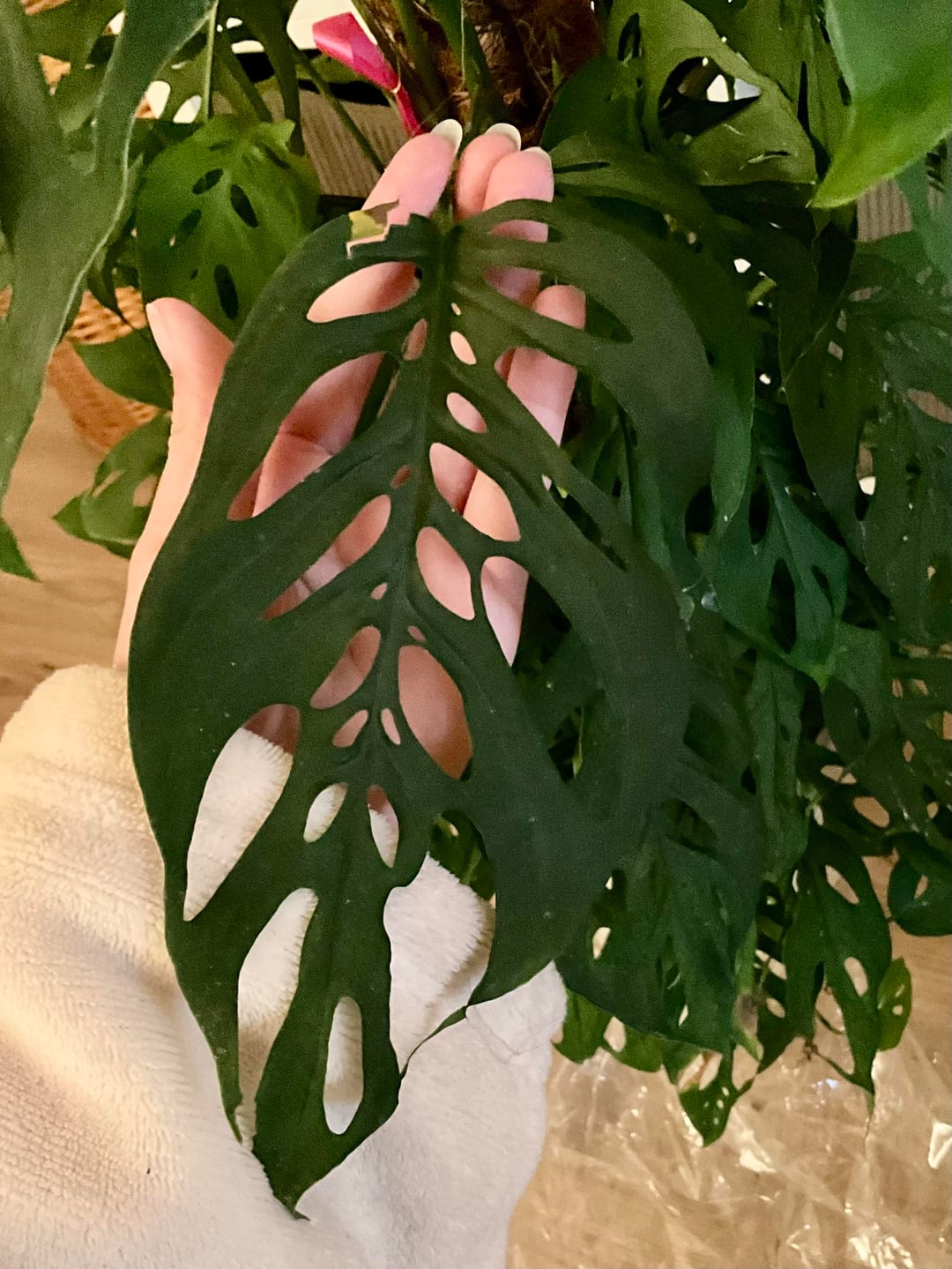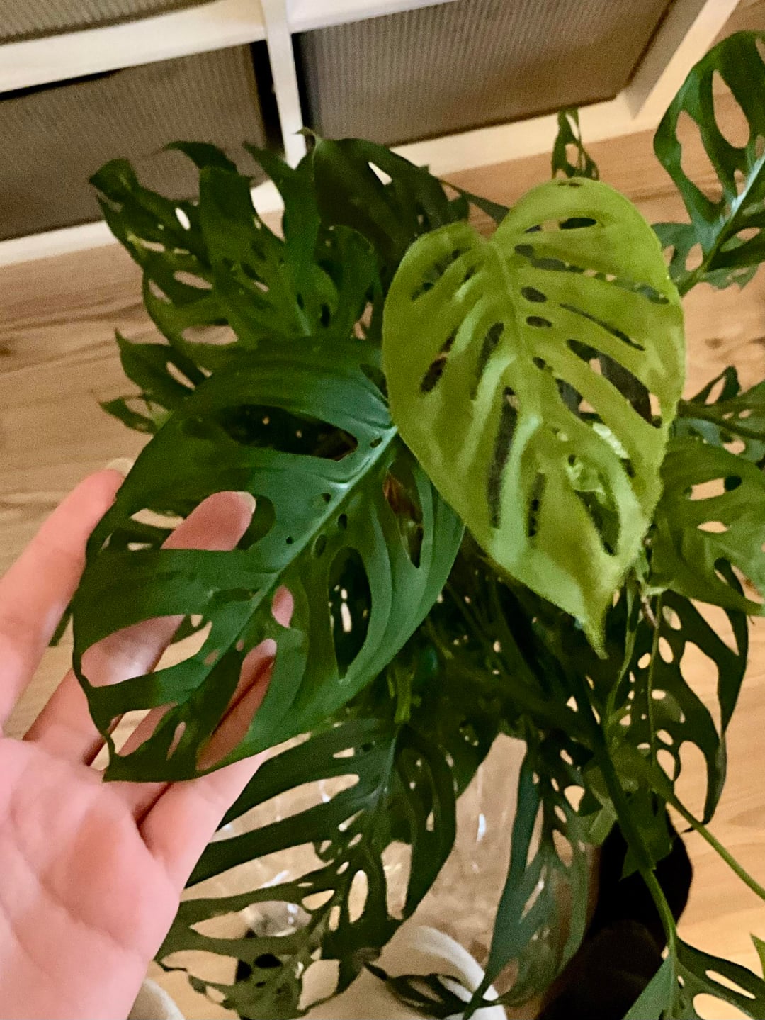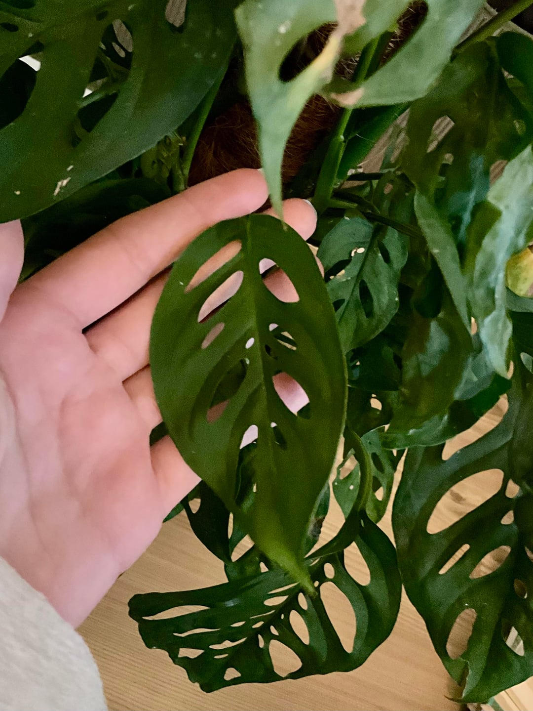 I found this beauty labelled as a Monstera Adansonii but I’m really not sure. I hope it is a huge esqueleto (that would be crazyyy), but i’m not really sure and Google image is not really helping me. Here is a few pictures of the bigger leaves, smaller leaves, and stem.