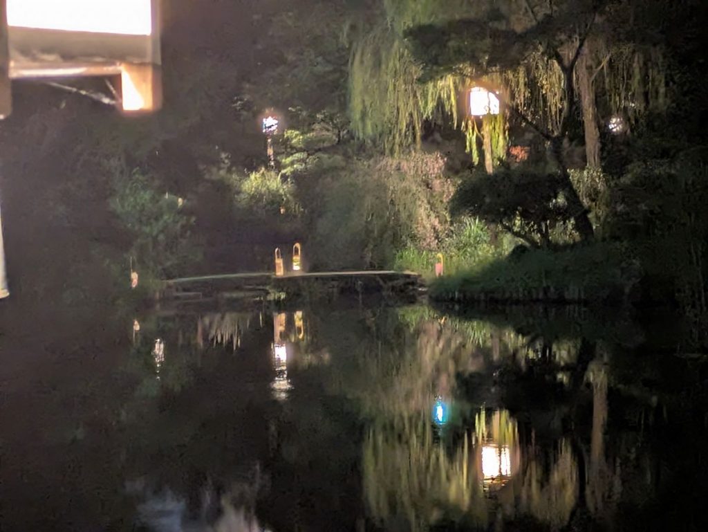 As dusk deepened, members of the Kurita Shachu ensemble performed koto music in the gazebo near the garden shop. The delicate plucking of the thirteen strings seemed to echo through the night air.