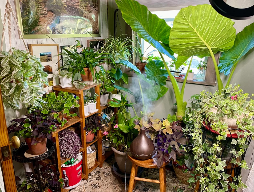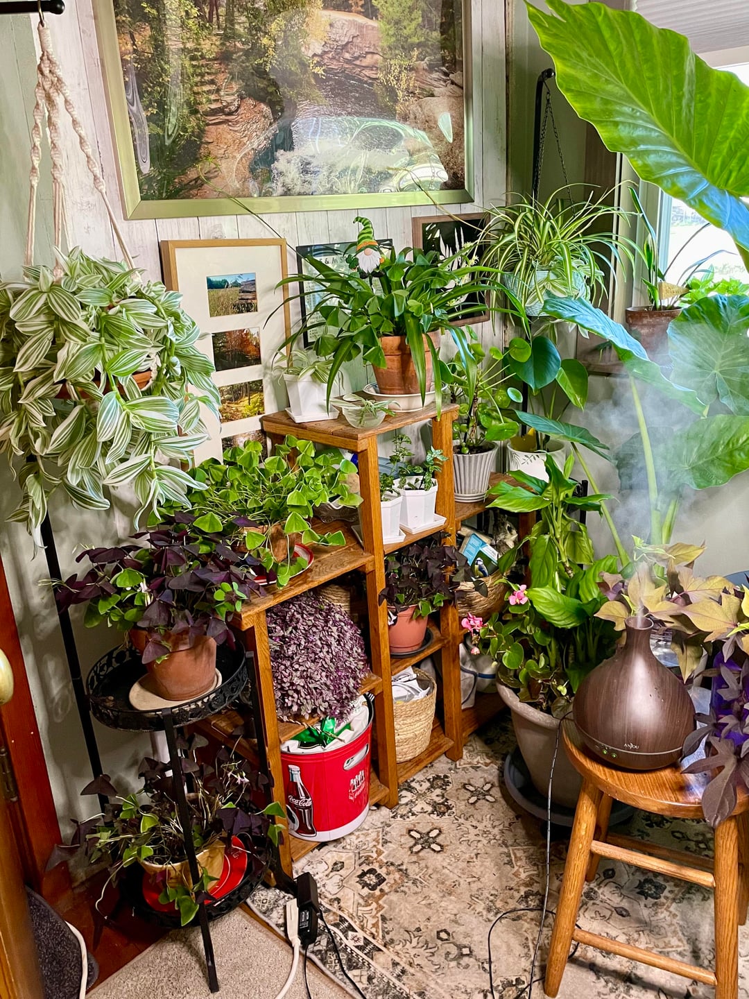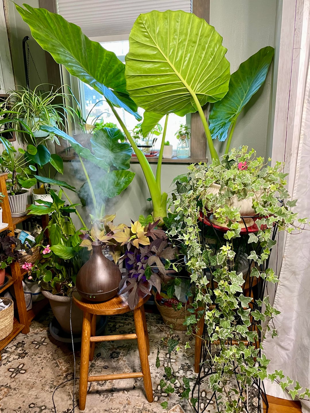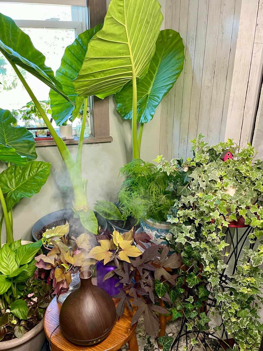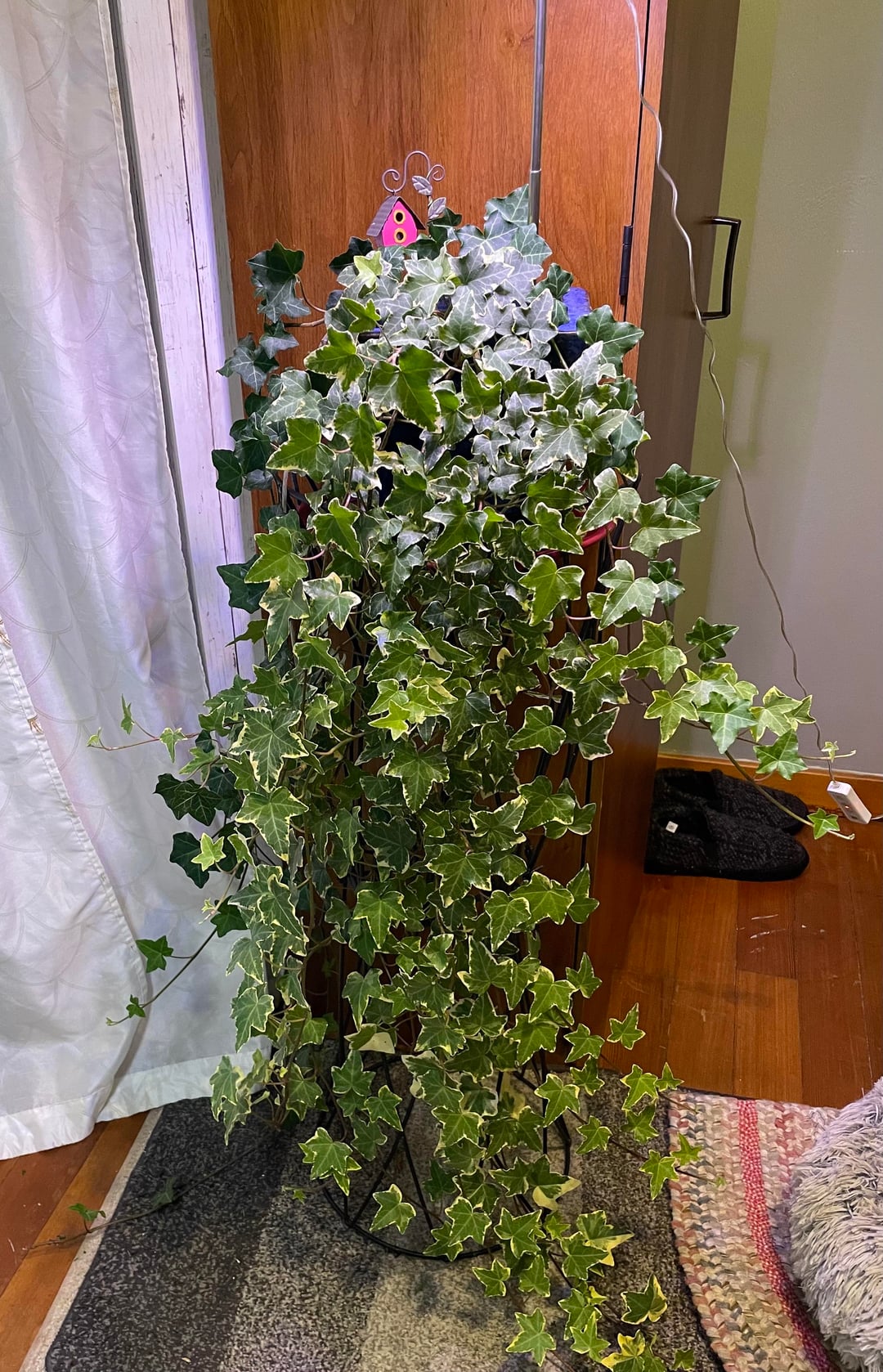 Last weekend we were 87F degrees. I brought in all my plants.Temperature this morning 28F. I have a small area for my plants but, made them fit 😆 I had to trim my elephant ears down to the newest two leaves. The new ones will be smaller in the house. Trying to overwinter some Begonias that grew with my Dieffenbachia over the summer. Sweet potato vines clipped & in water to root. It’s year 4 or 5 years for my purple ones. One plant has given me many! My ivy’s are beautiful this year. I think they’re around 3/4 years old. Mixed a couple varieties. (yes I use a grow light as well as windows)