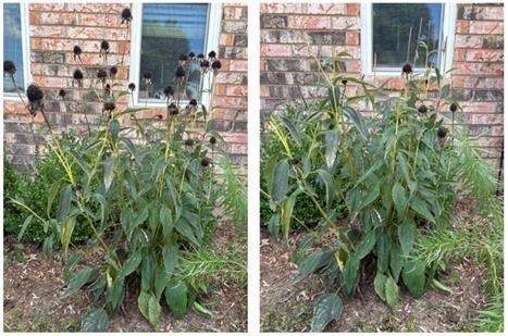 Left A purple coneflower with many spent blooms from the summer.Right After pruning, leaving stems at various heights for stem nesting native bees to overwinter and a few spent blooms for winter birds. Photo Credit: Photos courtesy of Courtney Dekalb-Meyers.